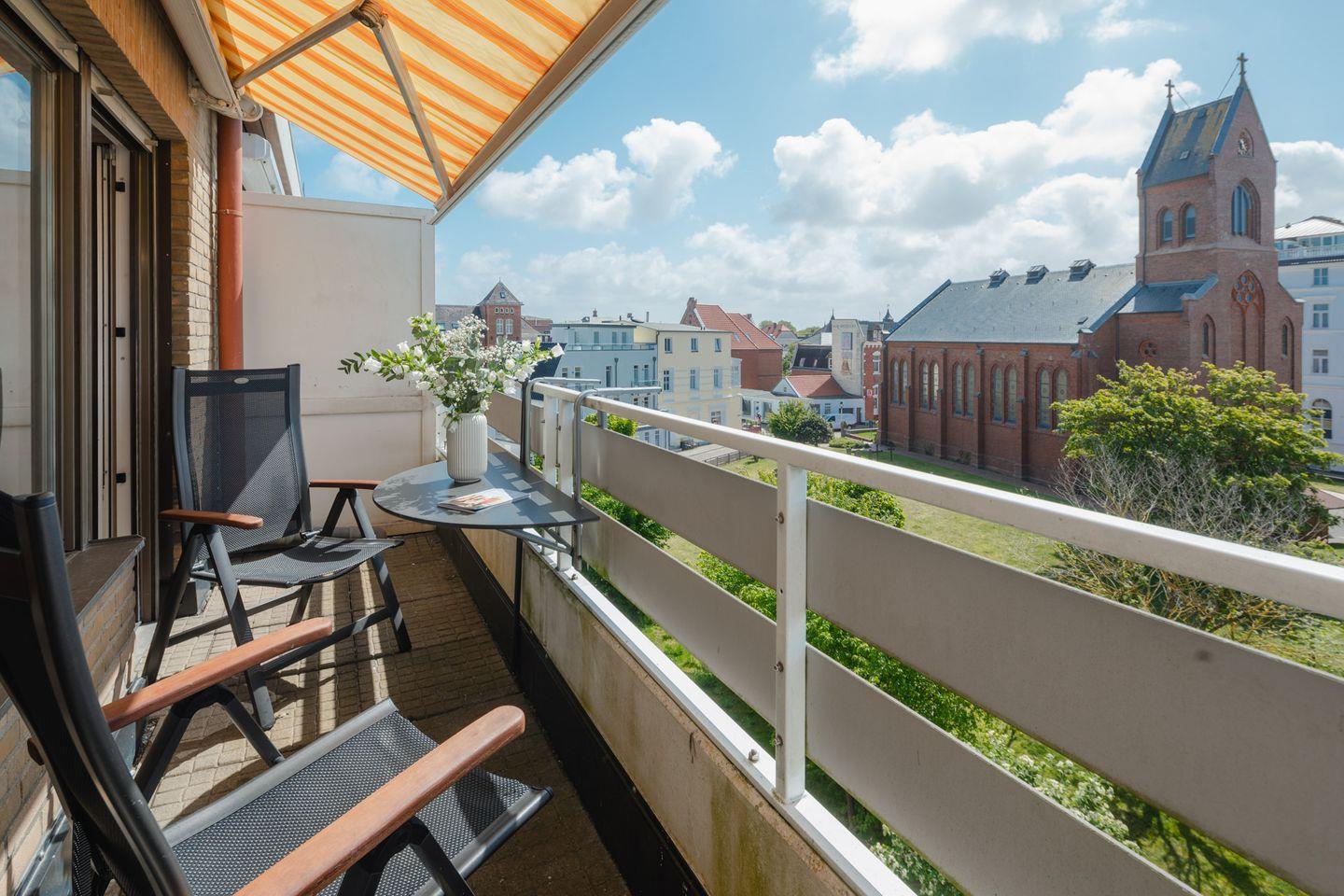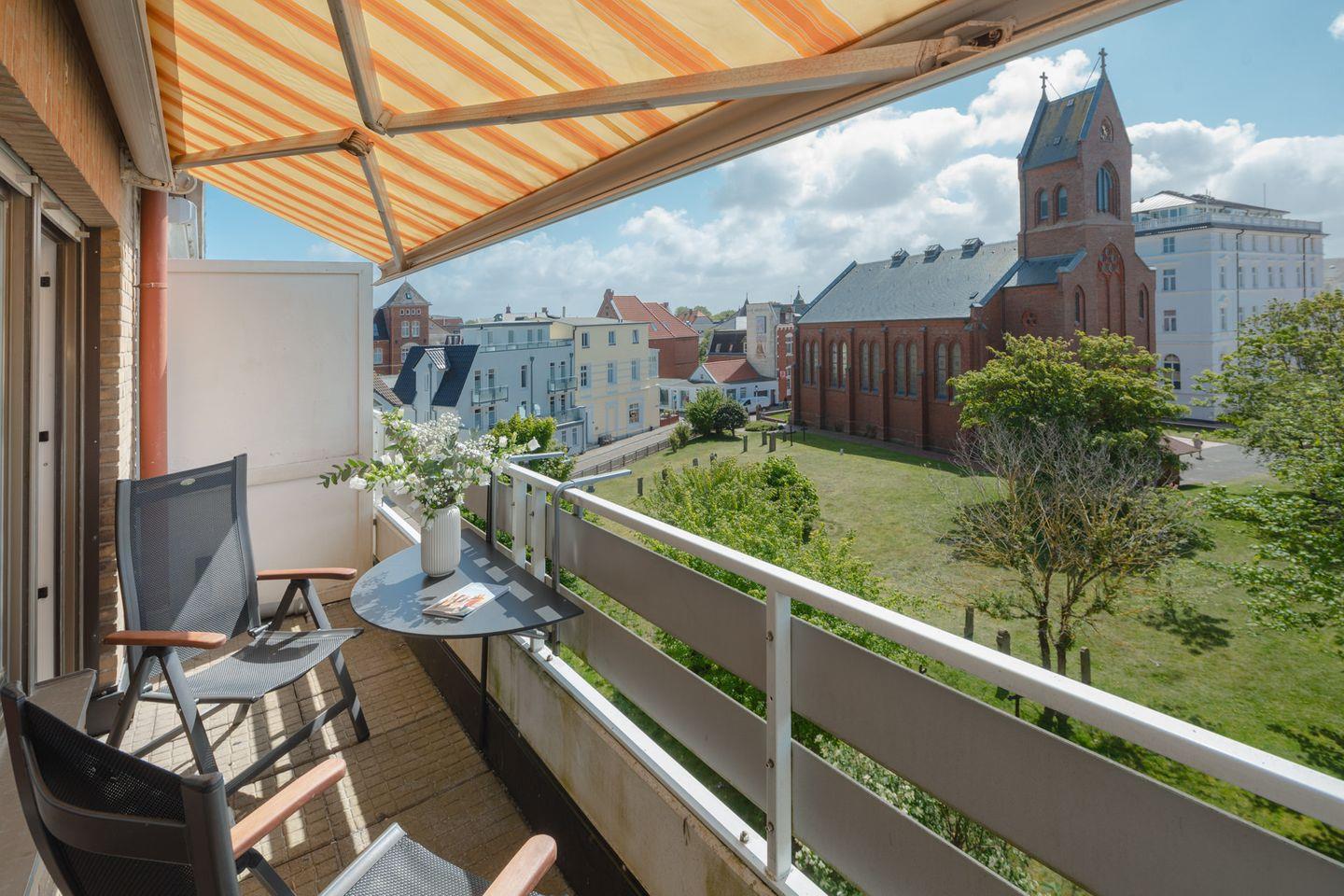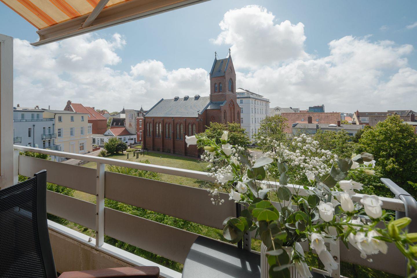 Die Ferienwohnung "Weitblick" befindet sich in der Kampstraße. Die Wohnung "Weitblick" liegt im dritten Stockwerk und bietet, wie der Name schon sagt, einen Blick über die Dächer von Norderney. Die Wohnung bietet auf ca. 57 Quadratmetern Platz für bis zu drei Personen und liegt direkt gegenüber der Inselkirche. Das Haus verfügt über keinen Aufzug.