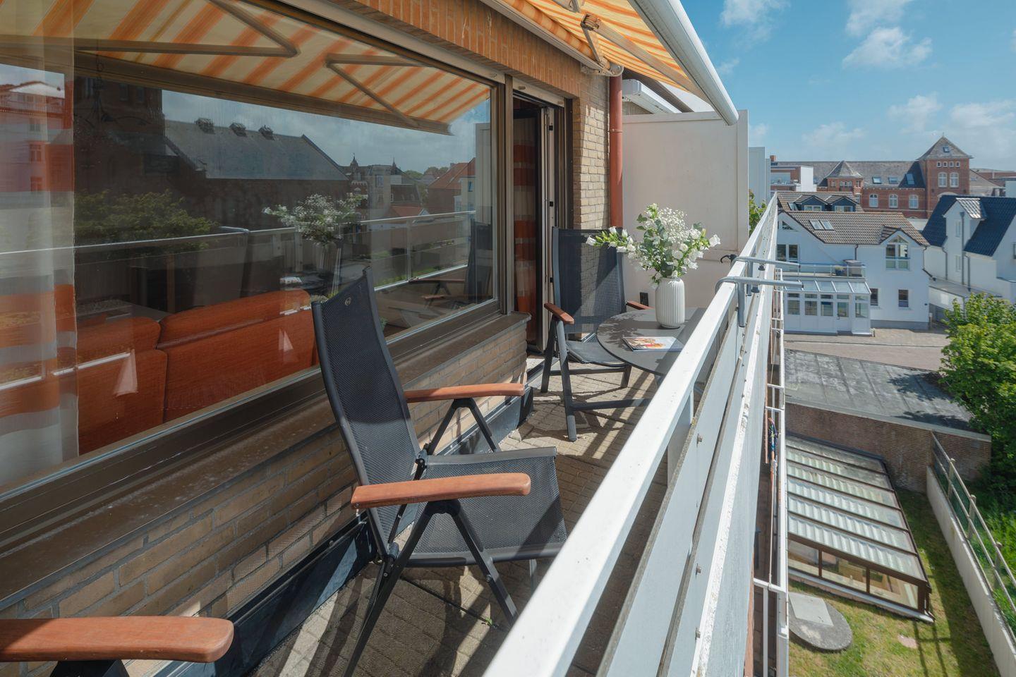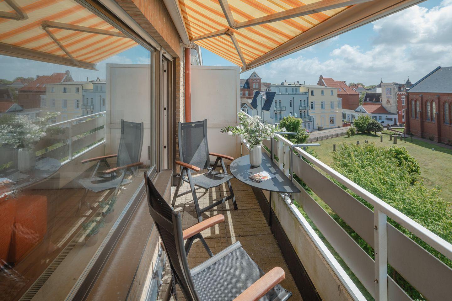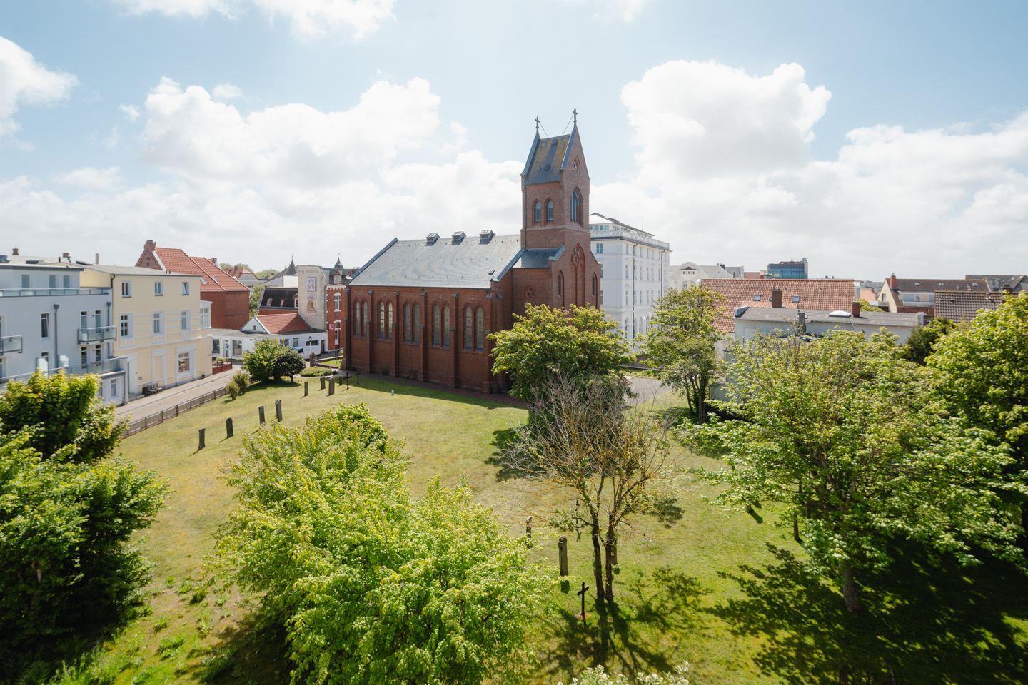 Die Ferienwohnung "Weitblick" befindet sich in der Kampstraße. Die Wohnung "Weitblick" liegt im dritten Stockwerk und bietet, wie der Name schon sagt, einen Blick über die Dächer von Norderney. Die Wohnung bietet auf ca. 57 Quadratmetern Platz für bis zu drei Personen und liegt direkt gegenüber der Inselkirche. Das Haus verfügt über keinen Aufzug.