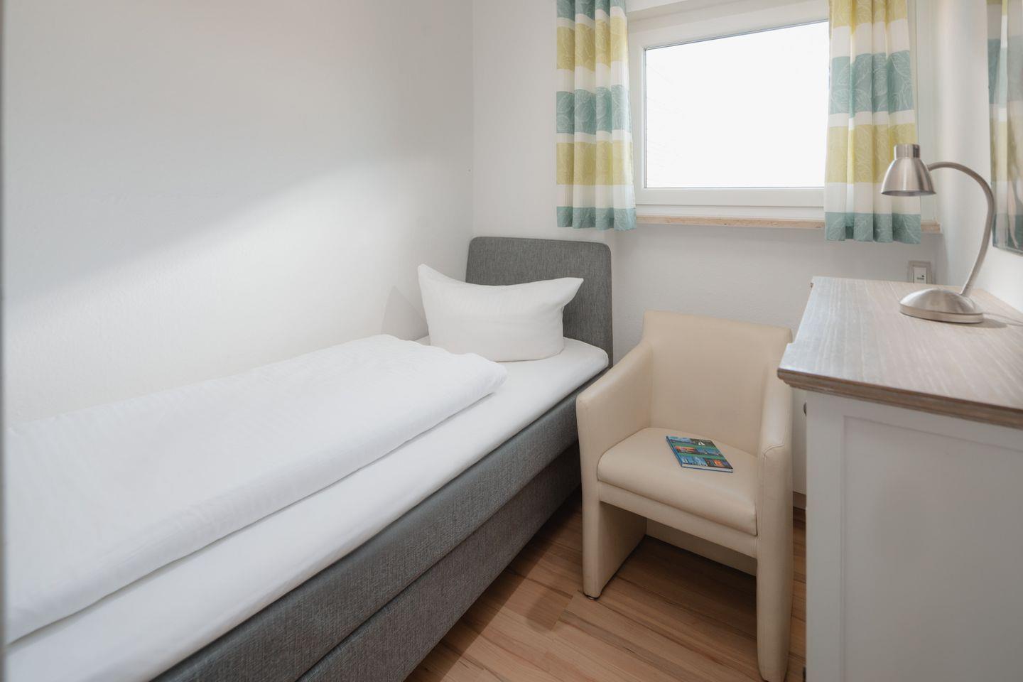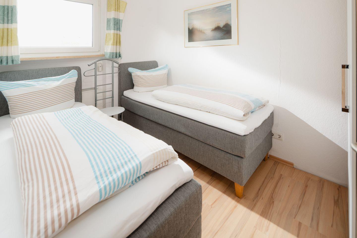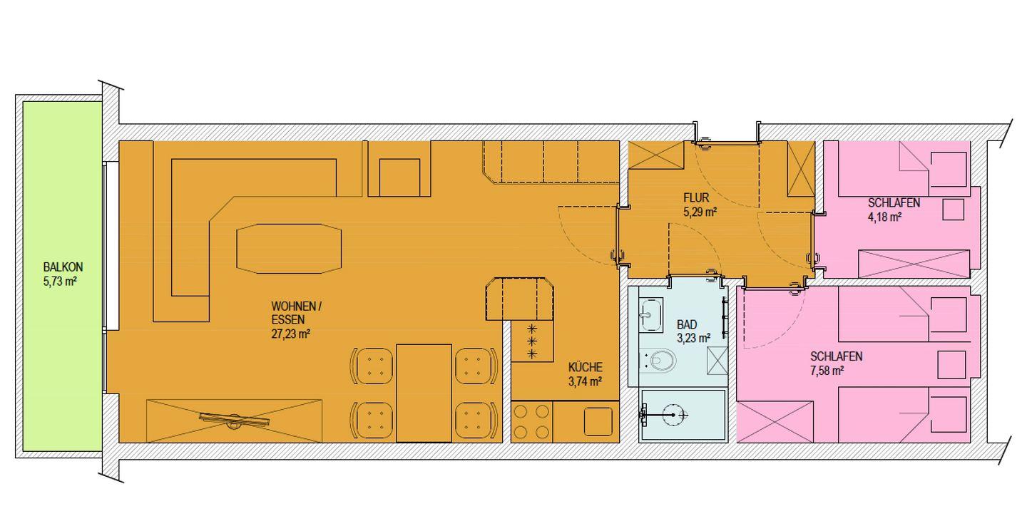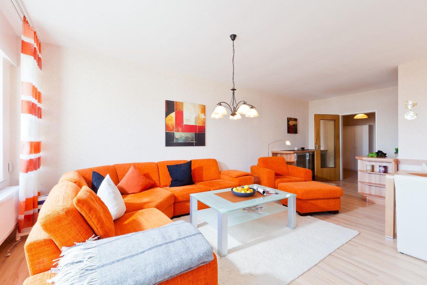 Die Einrichtung ist frisch und farbenfroh gestaltet. Die Wohnung verfügt über ein Wohnzimmer mit einer integrierten (voll ausgestatteten) Küchenzeile. Es gibt zwei Schlafzimmer, eines mit zwei Einzelbetten (0,80m x 2,00m) und eines mit einem Einzelbett (0,80m x 2,00m). Das moderne Badezimmer ist mit einer Dusche und einem WC ausgestattet. Ein kleines Highlight der Wohnung ist der nach Süden ausgerichtete Balkon. Für Fahrräder gibt es vor dem Haus Parkmöglichkeiten. Alternativ können Fahrräder auch im Keller abgestellt werden. Waschmaschine und Wäschetrockner befinden sich im Haus und stehen (für die gemeinschaftliche Nutzung gegen Münzeinwurf) zur Verfügung, was besonders für längere Aufenthalte von Vorteil ist. Haustiere (Hunde) sind in dieser Wohnung nicht erlaubt.