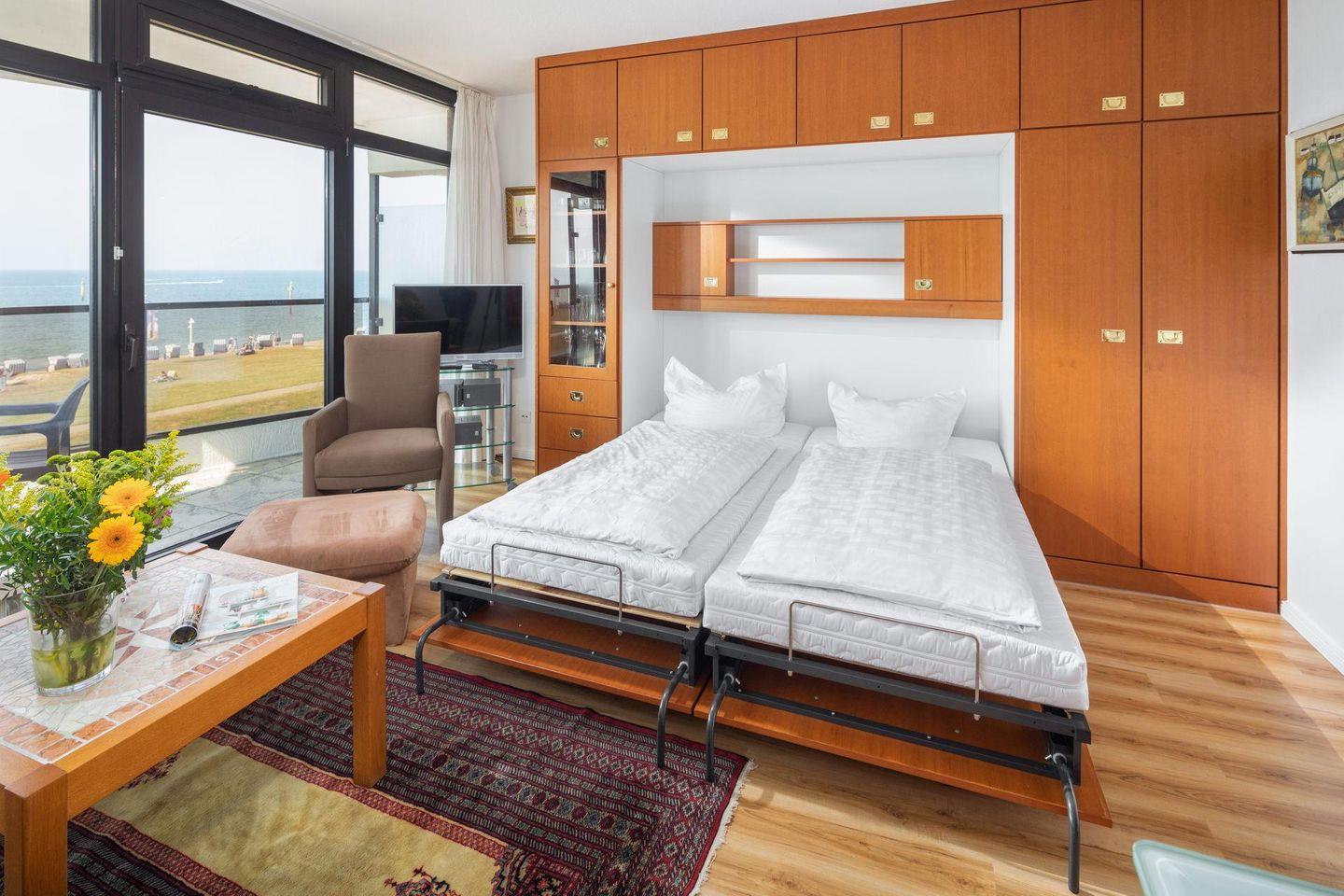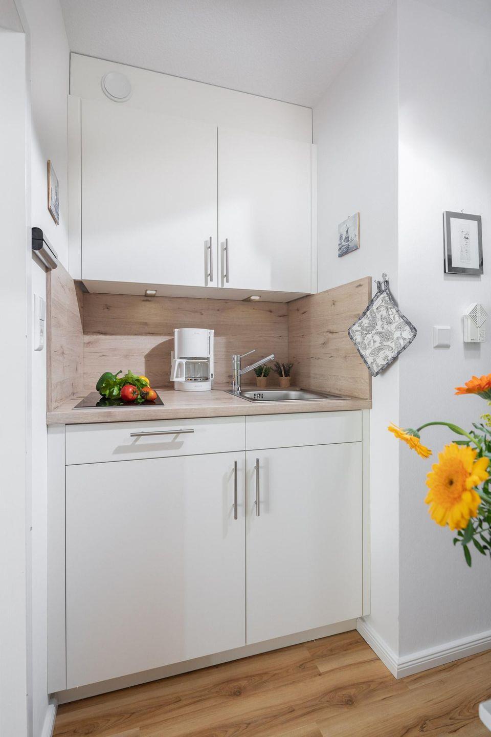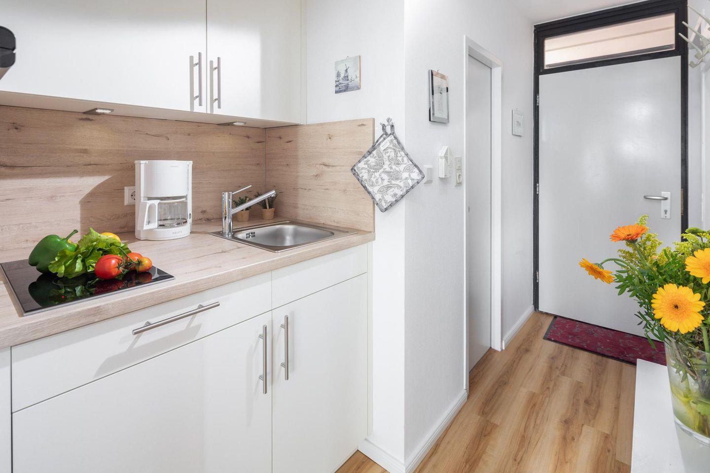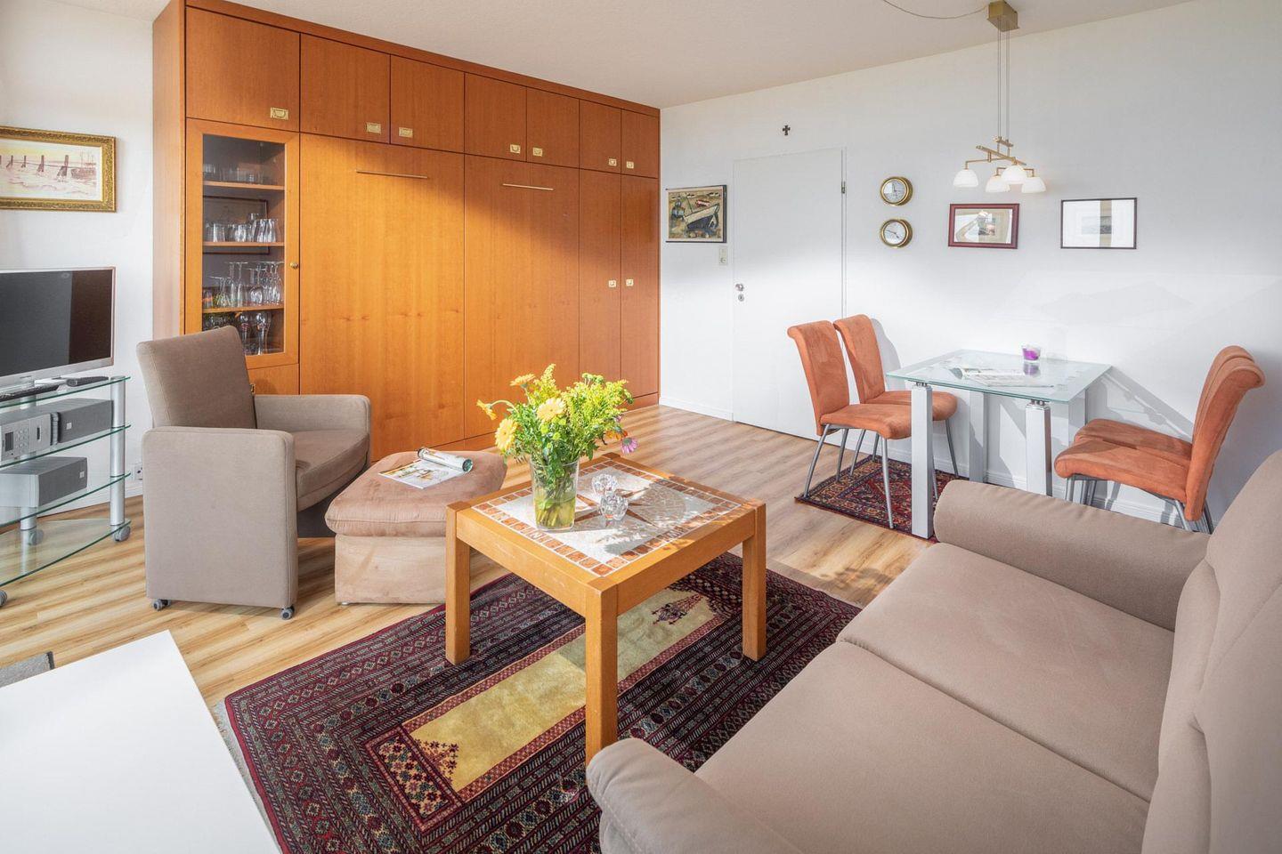 Die Wohnung verfügt über ein kleines Schlafzimmer mit einem Doppelbett (Breite 150 cm). Das Wohnzimmer bietet zusätzlich ein Schrankbett (zwei Einzelbetten, jeweils 90 cm breit), welches für zusätzliche Gäste oder Familienmitglieder genutzt werden kann. Die Wohnung bietet auch eine kleine, aber funktionale Küchenzeile. Hier befindet sich auch ein Herd mit zwei Kochstellen. Den Bewohnern des Hauses stehen gemeinschaftlich eine Waschmaschine und ein Wäschetrockner zur Verfügung, die gegen Münzeinwurf genutzt werden können. Ein Highlight des Europäischen Hofes ist ein Meerwasser-Pool. Der Pool wird jährlich im November für Wartungsarbeiten geschlossen. Zudem ist eine Sauna vorhanden, die ebenfalls gegen Münzeinwurf genutzt werden kann. Es ist wichtig zu beachten, dass der Meerwasser-Pool und die Sauna unter Einhaltung der geltenden Hygienevorschriften wieder zur Nutzung freigegeben sind. Allerdings können kurzfristige Änderungen eintreten. Hunde sind in dieser Ferienwohnung nicht erlaubt.