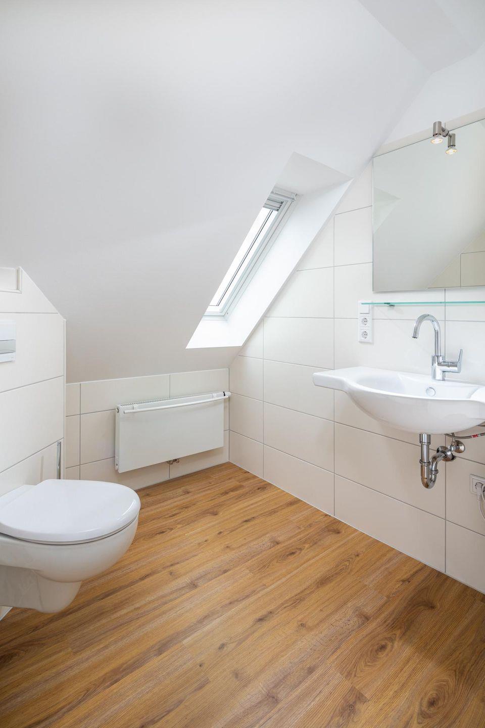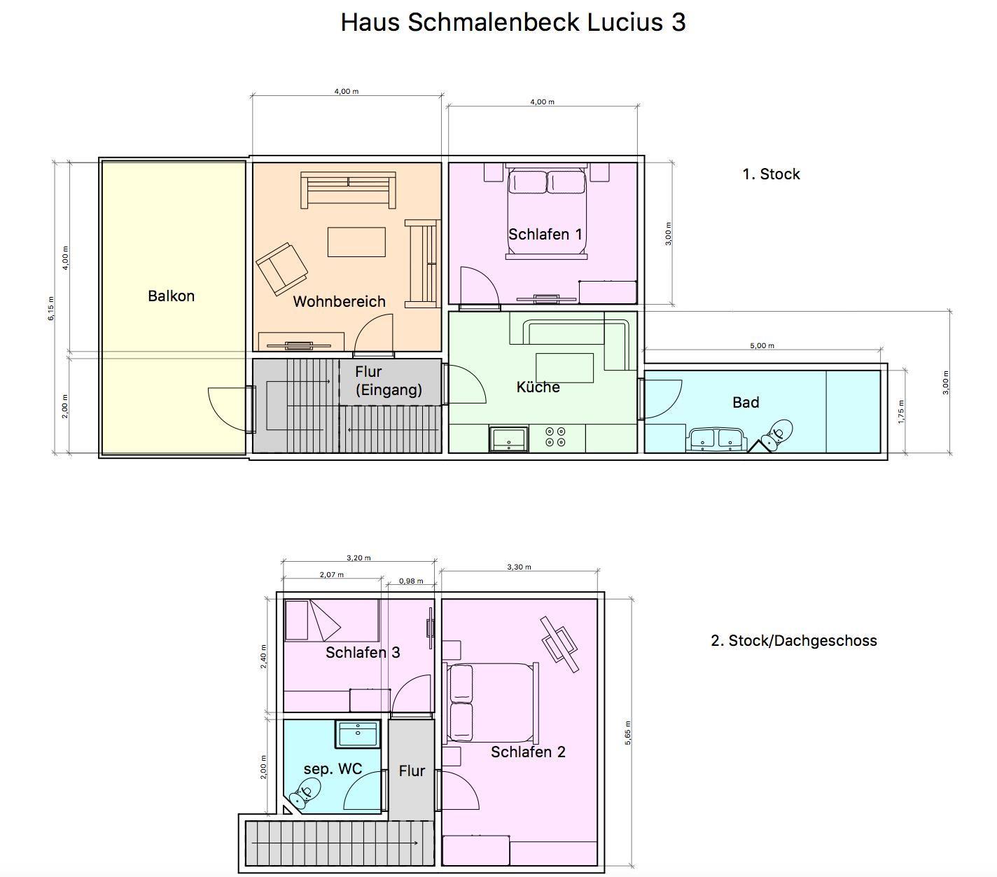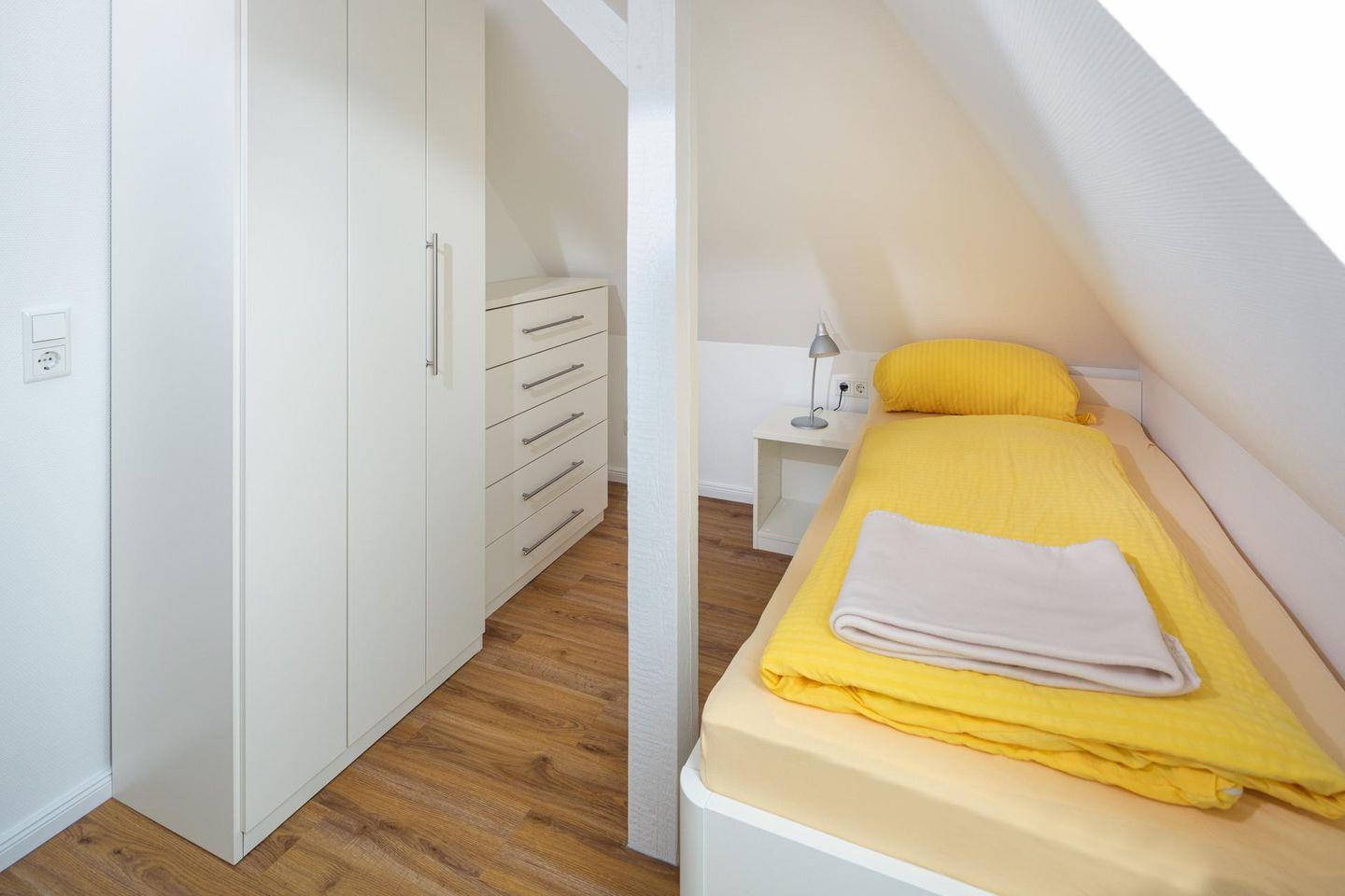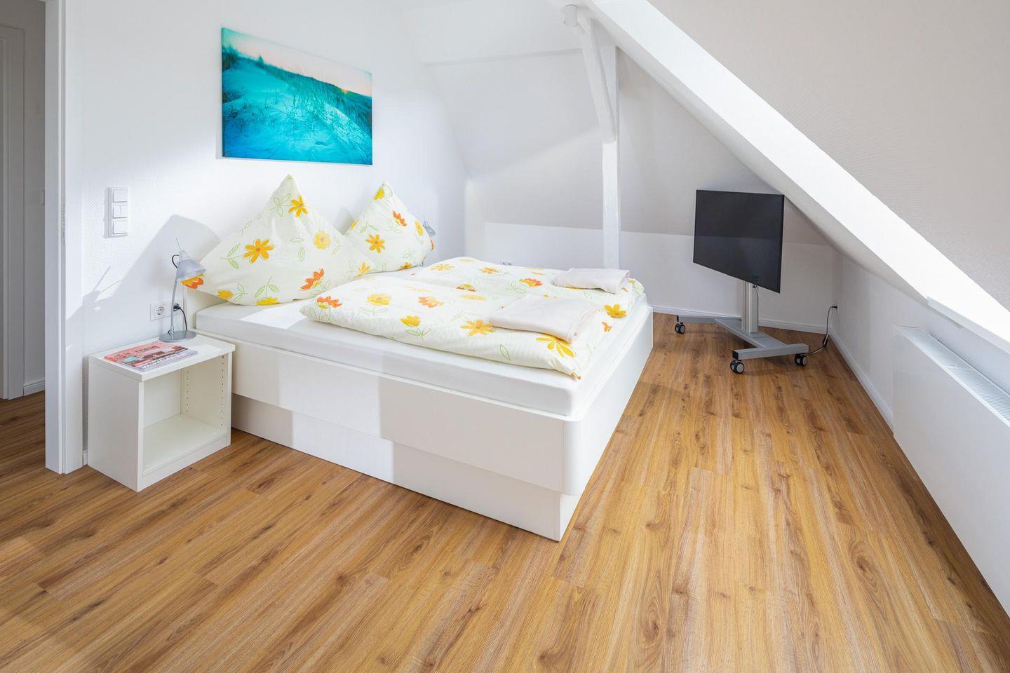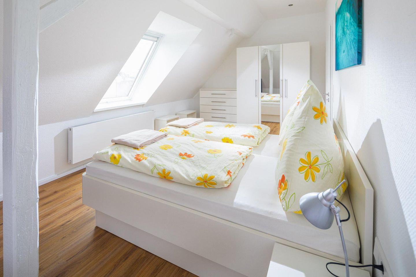 Die Wohnung erstreckt sich über zwei Etagen - den ersten Stock und das Dachgeschoss. Sie verfügt über insgesamt drei Schlafzimmer: zwei Schlafzimmer mit Doppelbett und ein Schlafzimmer mit Einzelbett.