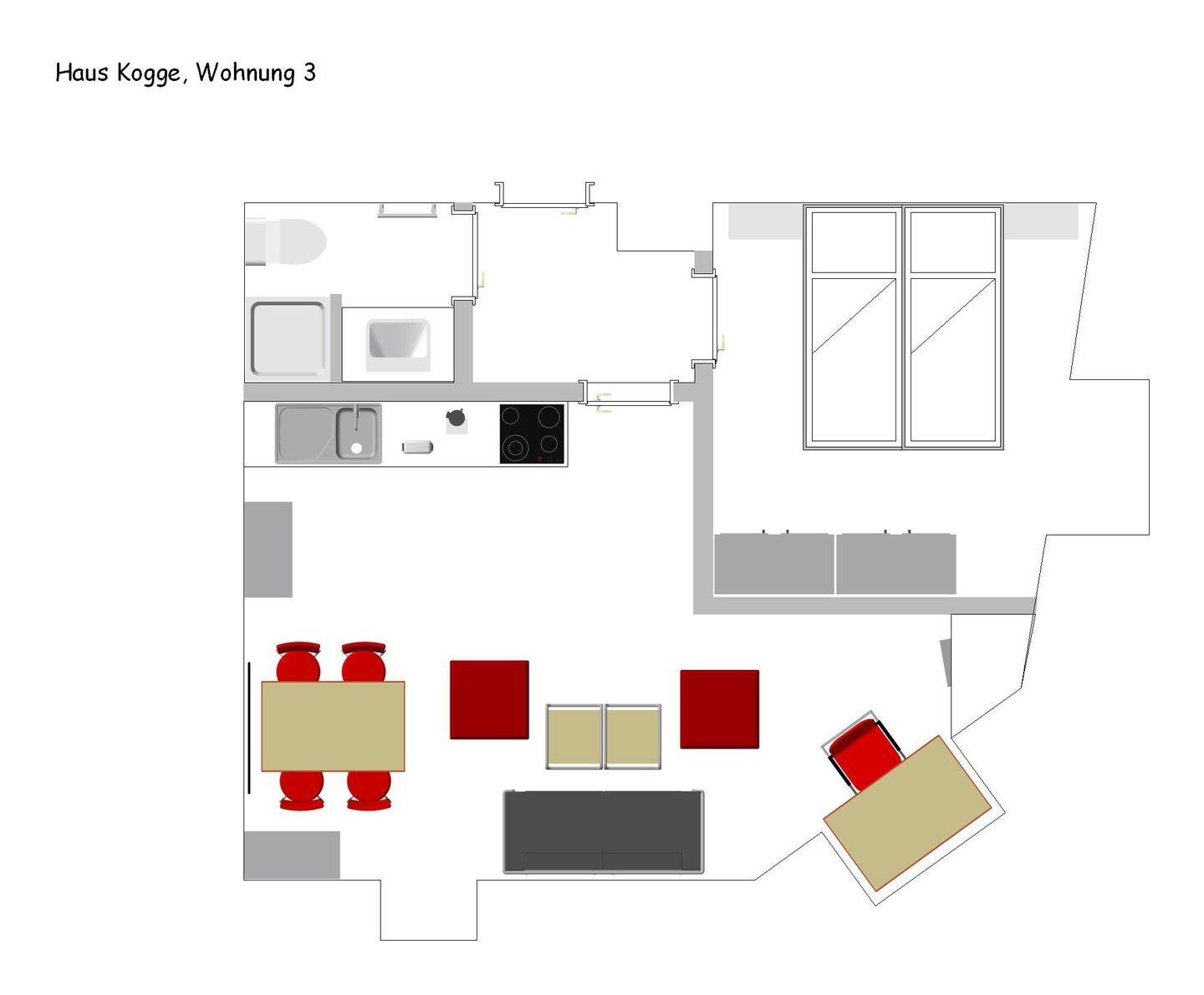 Die Ferienwohnung "Lüttje Dame 3" liegt im ersten Stock des Apartmenthauses "Die Kogge". Das Apartmenthaus liegt in der Luisenstraße. Im Haus gibt es einen Fahrstuhl. Die Wohnung bietet Platz für bis zu 4 Personen. Der Strand ist in unmittelbarer Nähe, nur ca. 140m entfernt. Auch zahlreiche Restaurants, Cafés und andere Einkaufsmöglichkeiten sind in wenigen Gehminuten erreichbar.
