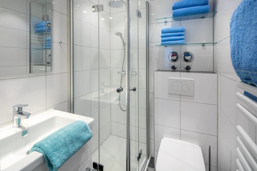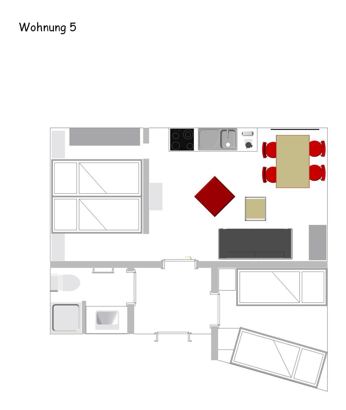 Die Wohnung ist mit einem abgetrennten Schlafbereich mit einem Doppelbett (2 Matratzen je 0,80m x 2,00m) und einem weiteren Schlafzimmer mit einem Einzelbett und einem Etagenbett (jeweils 0,80m x 2,00m) ausgestattet. Das Bad mit Dusche, WC und Handwaschbecken wurde erst 2020 komplett erneuert. Der Balkon (ca. 4qm) ist nach Westen ausgerichtet.