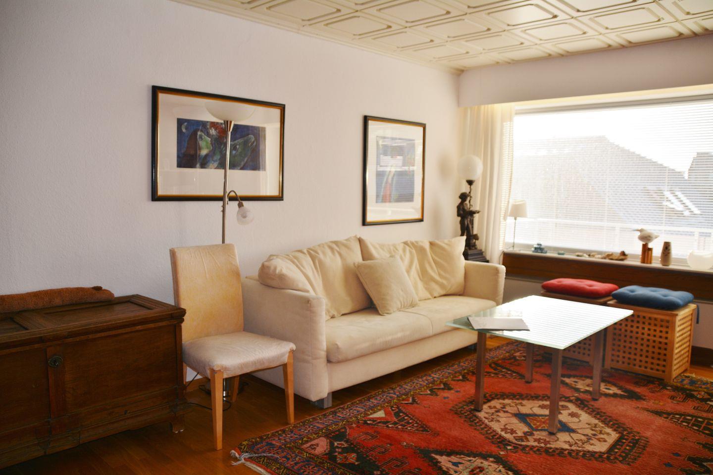 Die 1-Raum-Wohnung liegt im 2. Obergeschoss und besteht aus einem Wohn-/Schlafraum mit zwei getrennten Einzelschrankbetten, Sofa, Smart-TV, Stereoanlage und Zugang zum West-Balkon, einer Diele, einer kleinen Küchenzeile mit 2-Platten-Herd und Backofen sowie einem sanierten Duschbad mit WC und Fenster. Nichtraucherwohnung. Fahrstuhl vorhanden.
