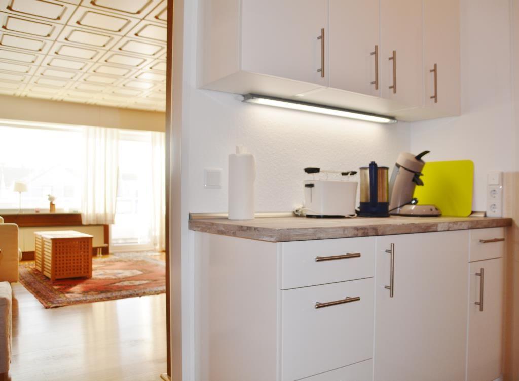 Die helle 1-Raum-Wohnung liegt im 2. Obergeschoss und besteht aus einem Wohn-/Schlafraum mit zwei getrennten Einzelschrankbetten, Sofa, Smart-TV, Stereoanlage und Zugang zum West-Balkon, einer Diele, einer modernen Küchenzeile mit 2-Platten-Herd und Backofen sowie einem sanierten Duschbad mit WC und Fenster. Nichtraucherwohnung. Fahrstuhl vorhanden.