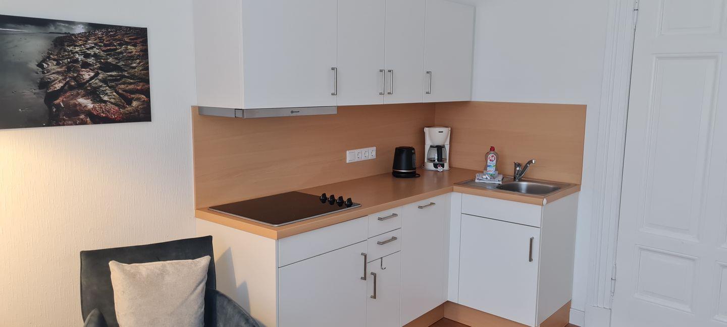 Das 2-Raum-Appartement in der 1. Etage verfügt über ein Wohnzimmer (TV), mit einer integrierten Küchenzeile und Essecke (Spülmaschine, 4-Platten-Ceranfeld). Ein Schlafzimmer mit Doppelbett und Dusche/WC sind vorhanden. Ein Parkplatz kann bei Verfügbarkeit für 2,50 € pro Tag hinzugemietet werden. WLAN vorhanden.