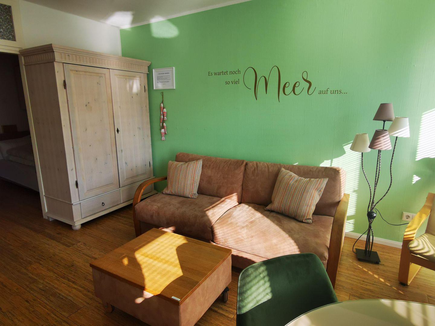 Die 1,5-Raum-Ferienwohnung (34qm²) verfügt über einen Wohn-/Schlafraum (Smart TV)mit hochwertiger Schlafcouch (160x200 mit Lattenrost & Gelmatratze), Edelstahlküche mit Ceranfeld, Kühlschrank & Spülmaschine sowie Badezimmer mit Dusche/ WC. Im Wohnflur befindet sich eine weitere Schlafcouch (Maßanfertigung mit 137cm Breite). Sie haben Zugang zum sonnigen Südbalkon. WLAN vorhanden. Die Unterkunft wurde nach Feng-Shui Richtlinien eingerichtet. Haustiere erlaubt (20,00 € Gebühr). Wohnung 118. NICHTRAUCHER!
