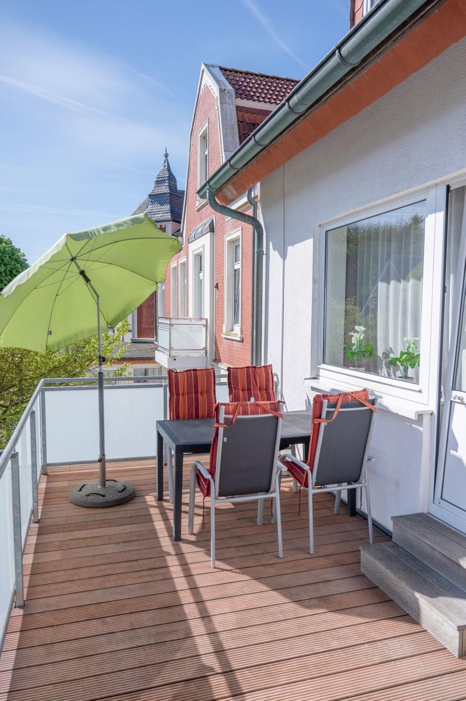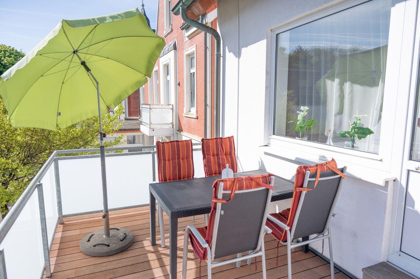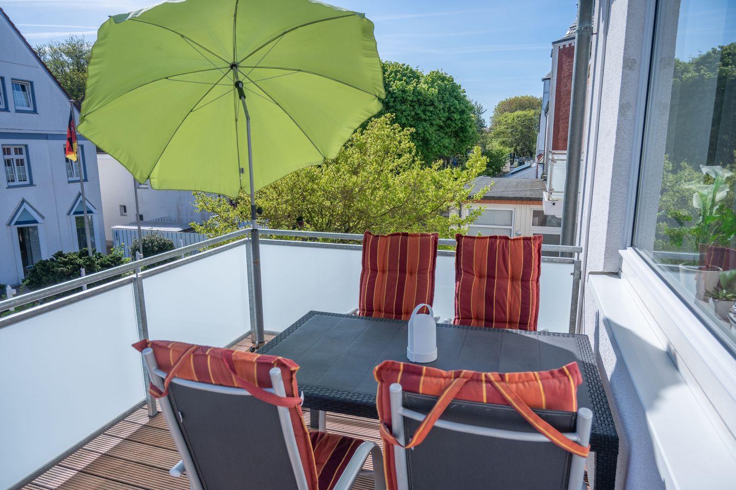 Die Ferienwohnung Strandflieder ist ca. 50 qm groß und bietet gehobene Wohnqualität. Die hellen Zimmer sind modern eingerichtet. Auf dem 18 qm großen Balkon kann man sehr schön entspannen. Die Ferienwohnung bietet Platz für bis zu 4 Personen und einen Hund.