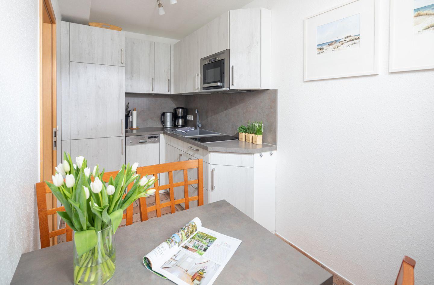 In dem großzügigen Wohnzimmer befindet sich ein 160 cm breites Schlafsofa. Der Balkon ist vom Wohnzimmer aus zu erreichen. Die separate Küche mit Essplatz ist modern eingerichtet. Sie ist unter anderem ausgestattet mit einem Geschirrspüler, Herd mit Cerankochfeld, Mikrowelle mit Backfunktion, einem Kühlschrank mit Gefrierfach, Kaffeemaschine, Wasserkocher sowie Toaster. Im Schlafzimmer befindet sich ein 180 cm x 200 cm Doppelbett sowie ein TV. Das Duschbad ist hell und modern gefliest. Das Angebot wird mit einem WLAN Zugang perfekt abgerundet.