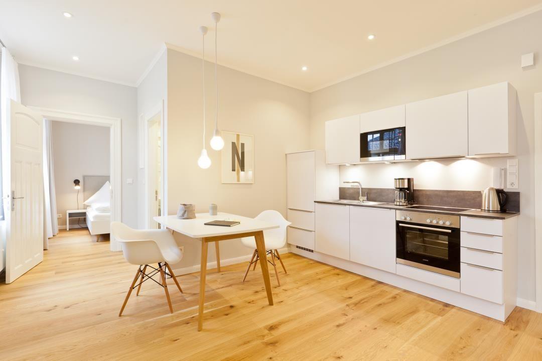Die offene Küche begeistert nicht nur durch ihre klaren Linien, sondern auch durch ihre moderne Ausstattung, einschließlich einer Spülmaschine. Hier können Sie Ihre kulinarischen Vorlieben nach Herzenslust ausleben. Die klaren Linien setzen sich im gesamten Design der Wohnung fort und schaffen eine verbindliche Atmosphäre, die Tradition und Moderne geschickt miteinander vereint.