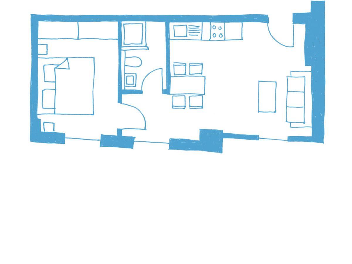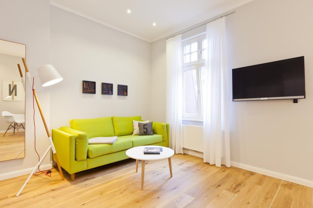 Die Ferienwohnung verteilt sich auf einen gemütlichen Wohnbereich mit offener Küche, ein separates Schlafzimmer mit Doppelbett (160x200cm) und TV sowie ein modernes Duschbad. Hier erleben Sie eine harmonische Verbindung von zeitgemäßem Komfort und historischem Charme. Das Schlafzimmer ist mit einem Flat TV ausgestattet, um Ihnen entspannte Abende zu ermöglichen.