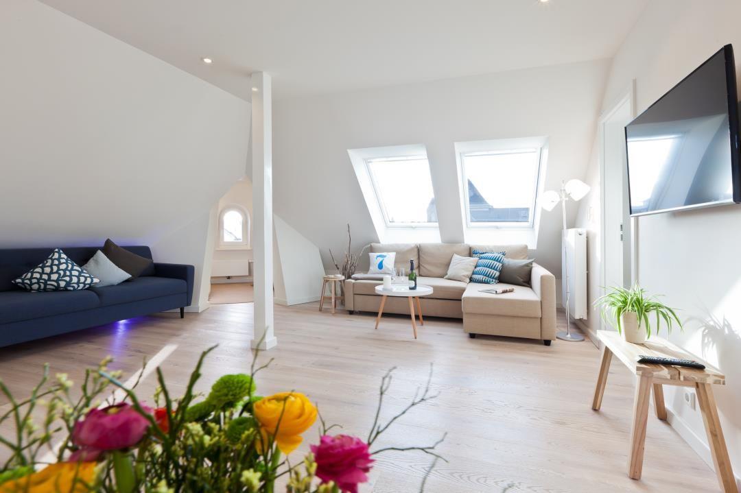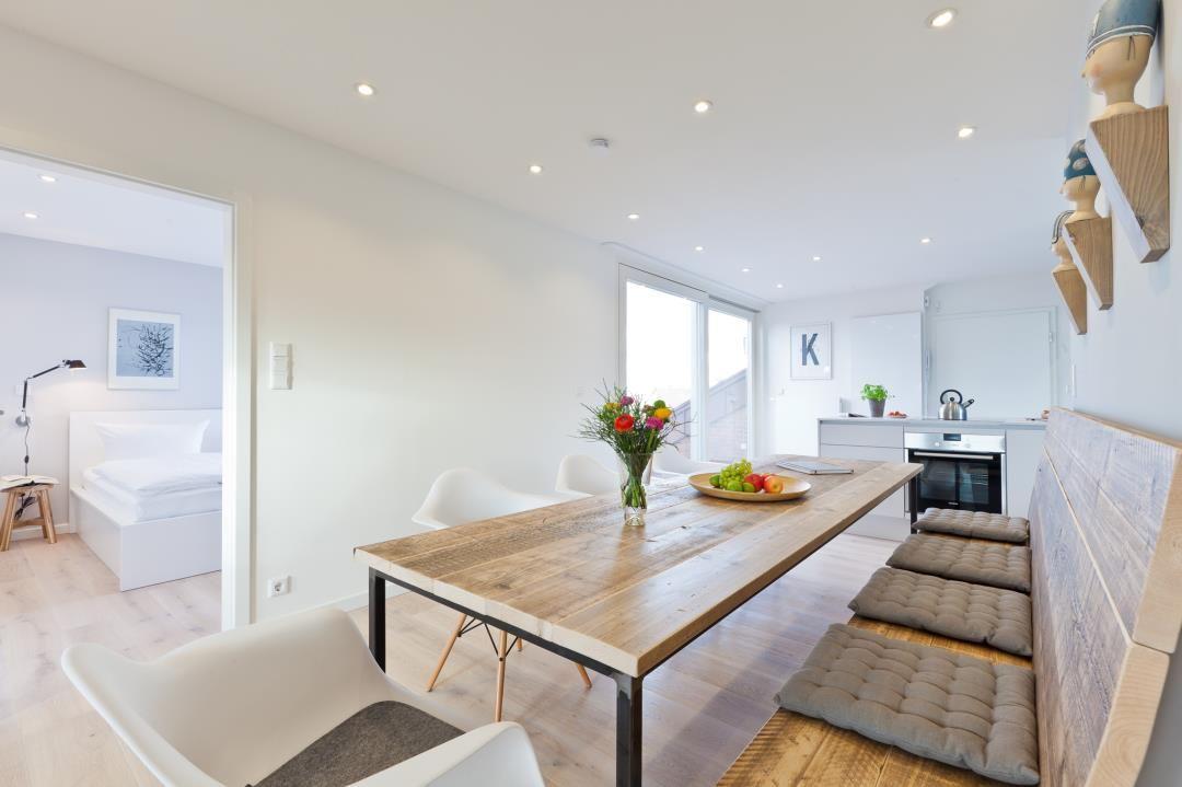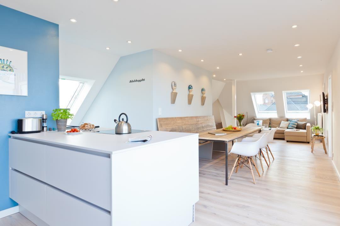 Freuen Sie sich auf einen erholsamen Urlaub in dieser stilvollen Ferienwohnung in der Penthouse-Etage im 3. Obergeschoss. Sie befindet sich in der "Soltau'schen Buchdruckerei" (alte Norderneyer Badezeitung) und wurde 2015 unter Denkmalschutz aufwendig kernsaniert und modernisiert. Seitdem erstrahlt die Wohnung für Sie im neuen Glanz. Insgesamt ist die Ferienwohnung für 5 Personen auf 75 m² ausgerichtet. Ihnen steht ein großzügiger Wohnbereich mit Küche, zwei separate Schlafzimmer mit Doppelbetten und Einbauschränken, sowie zwei Bäder (eins mit Wanne, eins mit Dusche) zur Verfügung. Zudem können Sie Waschmaschine und Trockner (gegen Gebühr) und den Fahrradraum im Haus
