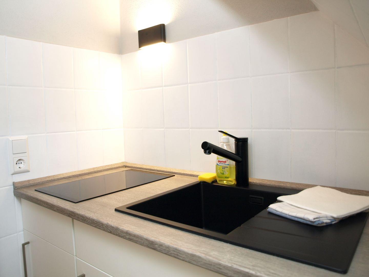 Die separate kleine Küche ist ausgestattet mit Ceran-Kochfeld, Kühlschrank mit Gefrierfach, Kaffeemaschine, Toaster und Wasserkocher. Direkt unter dem Dachfenster befindet sich ein einladender Essbereich für zwei Personen.