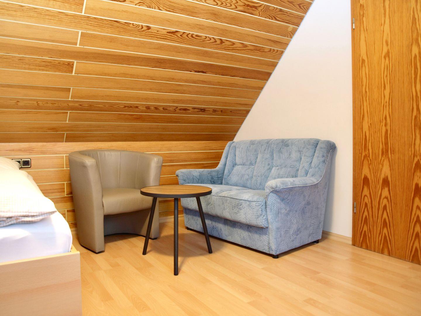 Der Wohn- und Schlafbereich verfügt über eine gemütliche Sitzecke mit Flachbildfernseher sowie ein Doppelbett.