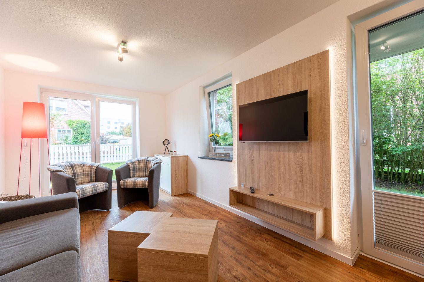 Die komfortable und sehr geschmackvoll eingerichtete Ferienwohnung auf ca. 80 qm und drei Räumen überzeugt durch ihre ruhige Lage. Der lichtdurchflutete Wohnbereich mit bodentiefen Fenstern verfügt über einen geräumigen Essplatz für 4-6 Personen. Im Wohnzimmerbereich können Sie auf der großen Couch (auch als Schlafsofa nutzbar) und den gemütlichen Cocktailsesseln entspannen. Hier haben Sie einen großen Flachbildschirm – TV & Radio.