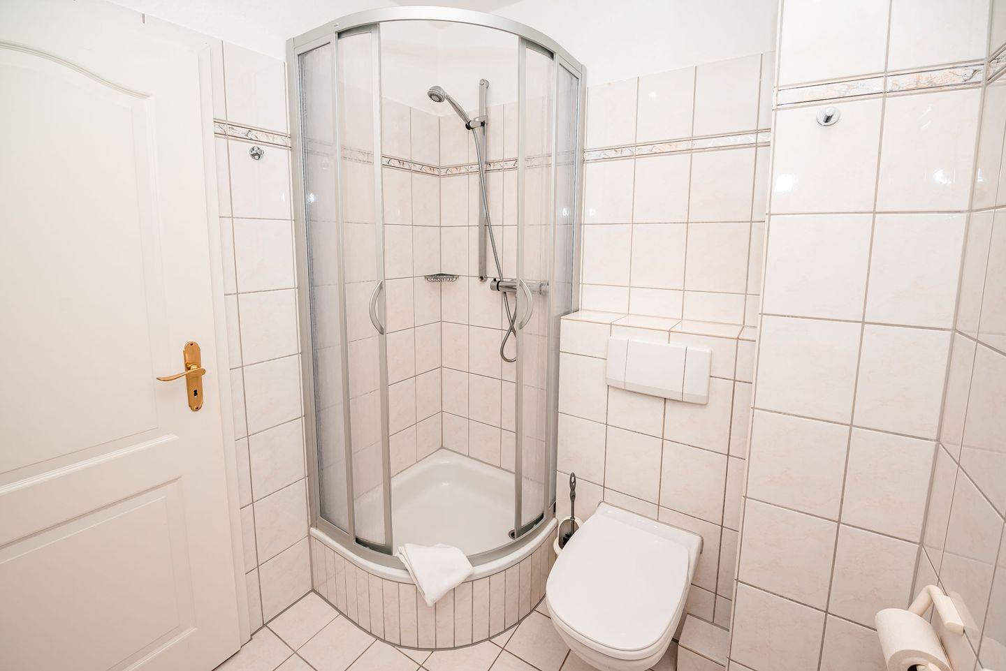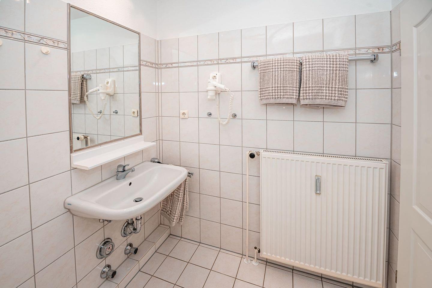 Das moderne Badezimmer verfügt über Dusche, WC, einen Handtuchtrockner sowie einen Fön.
