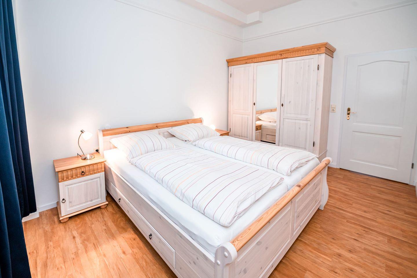 Im separaten Schlafzimmer erwartet Sie ein komfortables Doppelbett (1,80 x 2,00 m) sowie ein großzügiger Kleiderschrank mit viel Stauraum für Ihr Gepäck.