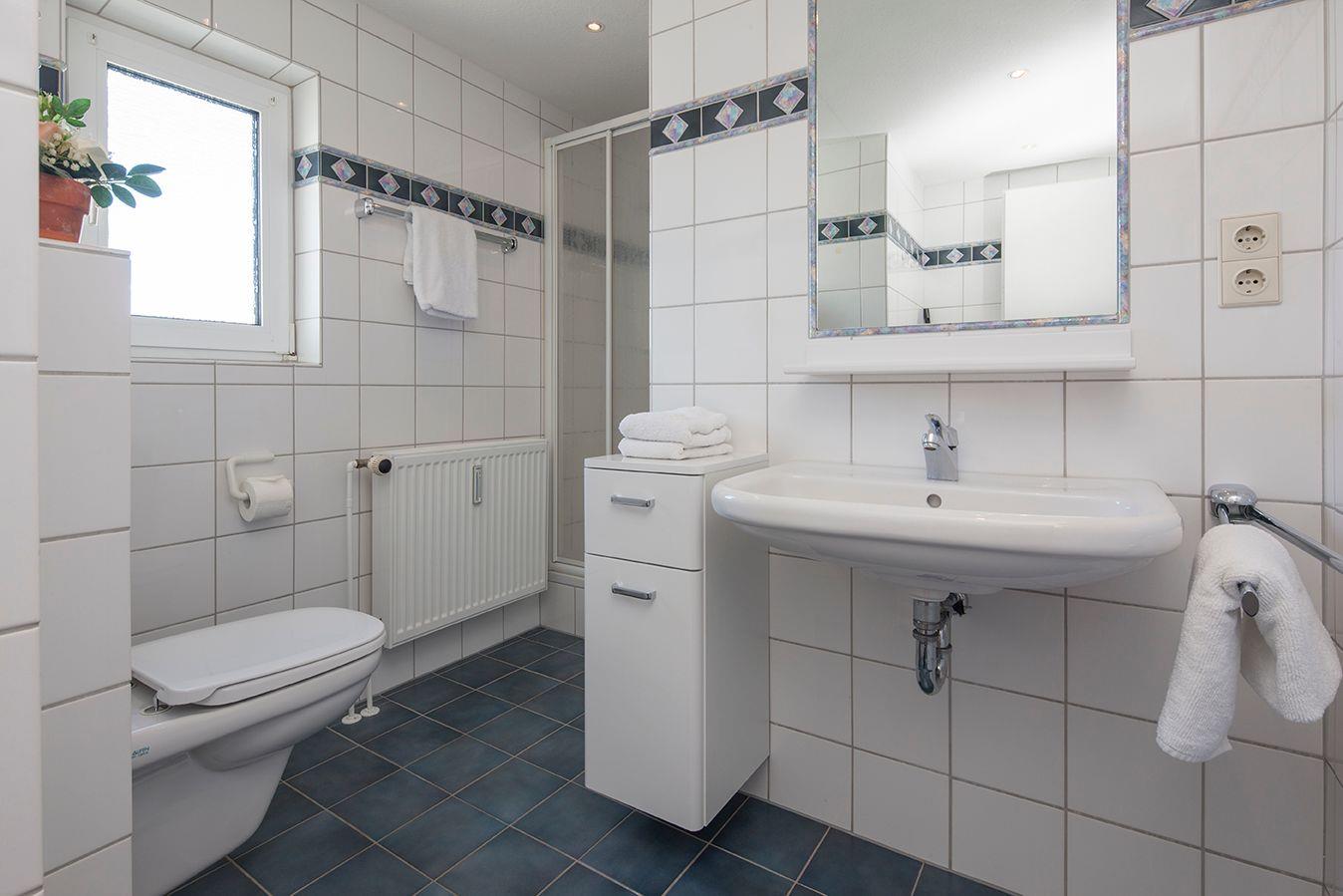 Das modern ausgestattete Badezimmer mit Dusche WC und einem Fenster ist über einen kleinen, internen Treppenaufgang mit sieben Stufen erreichbar – funktional, hell und freundlich gestaltet.
