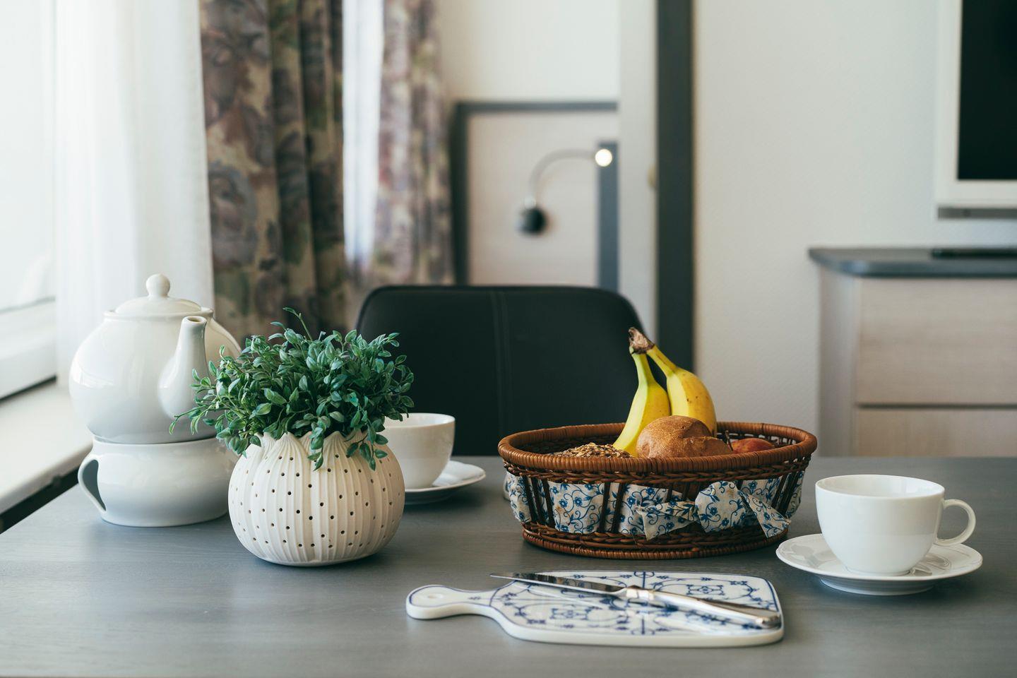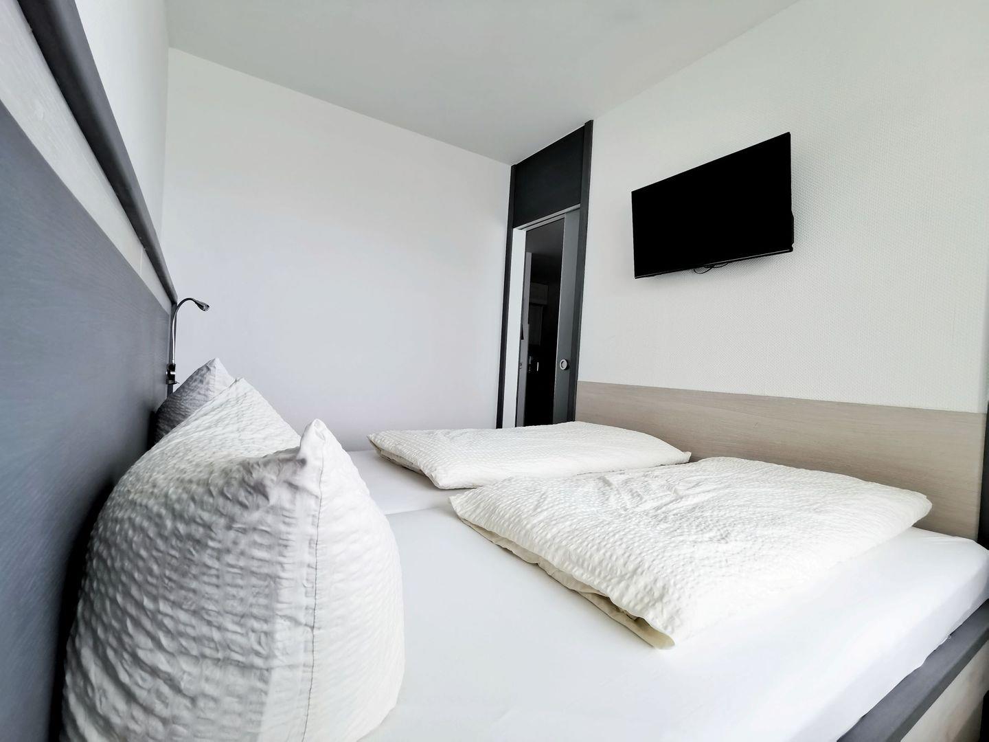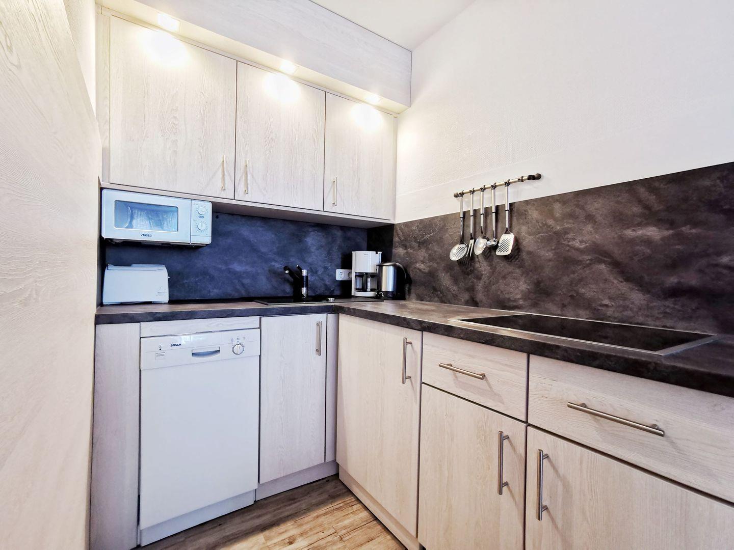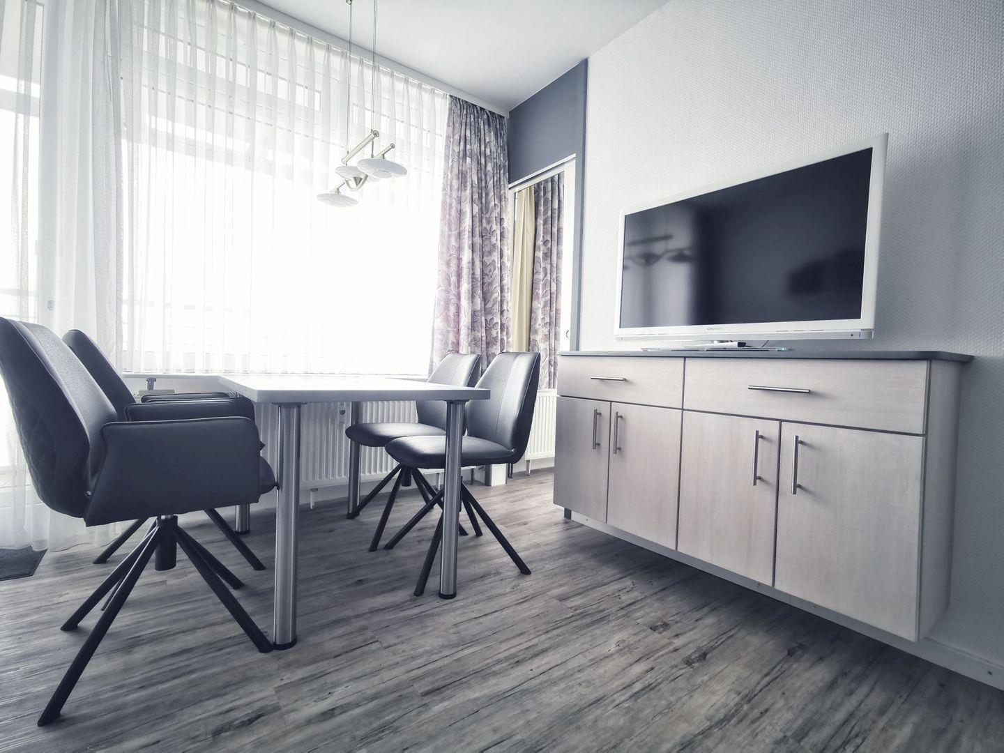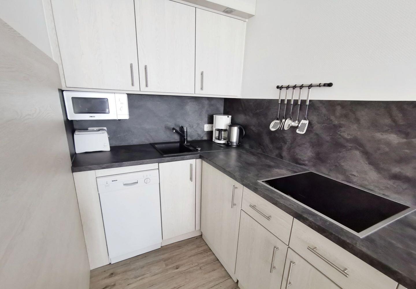 Die Wohnung verfügt über ein separates Schlafzimmer mit einem Doppelbett (1,80 x 2,00 m) sowie einen einladenden Wohnraum mit gemütlicher Sitzecke und Schlafcouch. Die integrierte Küchenzeile ist funktional ausgestattet und der Essplatz vor dem Fenster lädt zu gemeinsamen Mahlzeiten mit Blick ein.