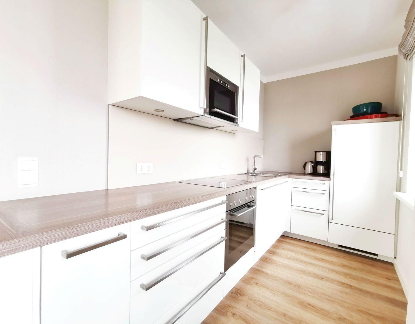 Die offene, komplett ausgestattete Küchenzeile ist mit hochwertigen Geräten versehen, darunter Geschirrspüler, Cerankochfeld, Backofen, Mikrowelle, Kühlschrank, Kaffeemaschine, Toaster und Wasserkocher. So wird die Zubereitung von Frühstück, Mittag- oder Abendessen zum wahren Vergnügen für die ganze Familie.