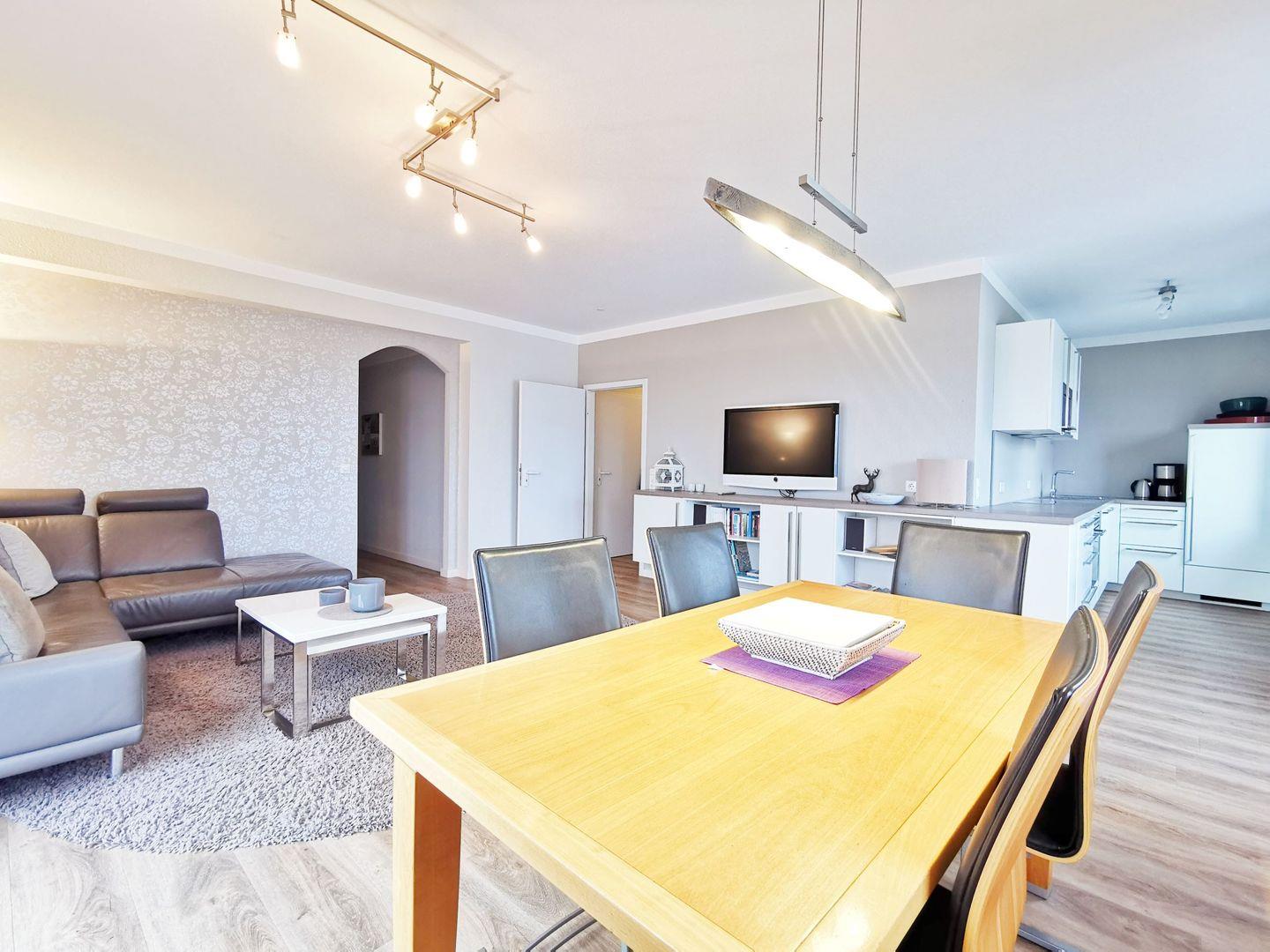 Der helle und freundliche Wohnbereich besticht durch eine großzügige Sofalandschaft sowie einen separaten Essbereich, die zusammen eine einladende und zugleich moderne Atmosphäre schaffen. Für Unterhaltung sorgen Kabel-TV mit großem Flachbildschirm, ein DVD-Player sowie eine Stereoanlage.
