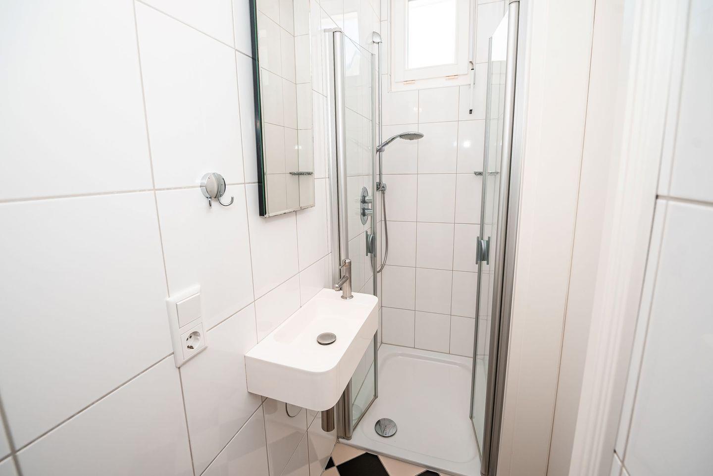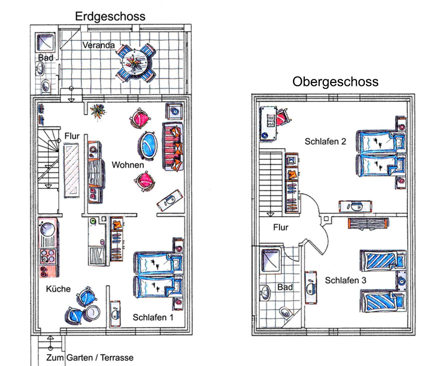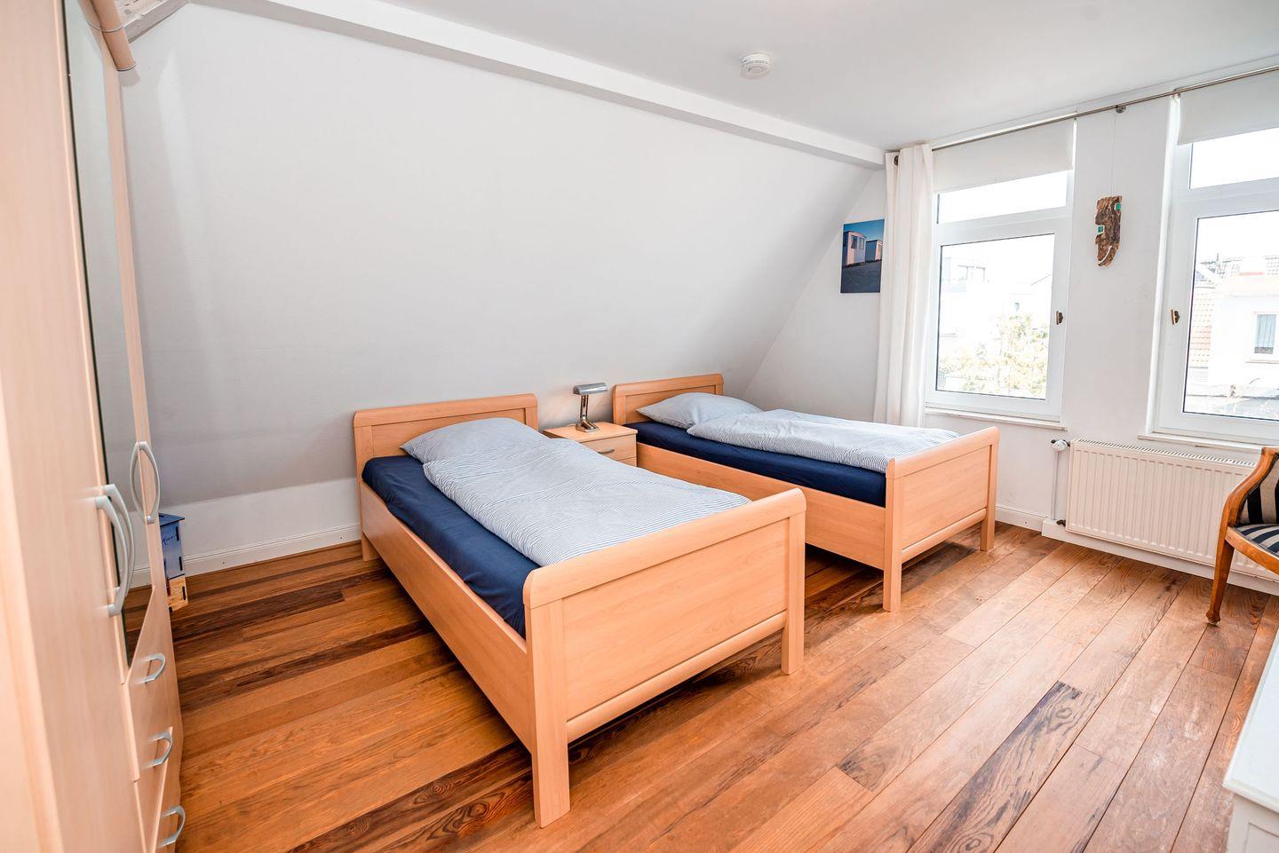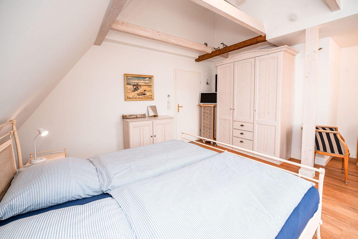 Im Obergeschoss erwarten Sie zwei weitere Schlafzimmer: eines mit Doppelbett, das andere mit zwei Einzelbetten. Beide Zimmer sind mit Fernsehern ausgestattet. Auf dieser Etage befindet sich außerdem ein zweites, großzügiges Duschbad mit WC.