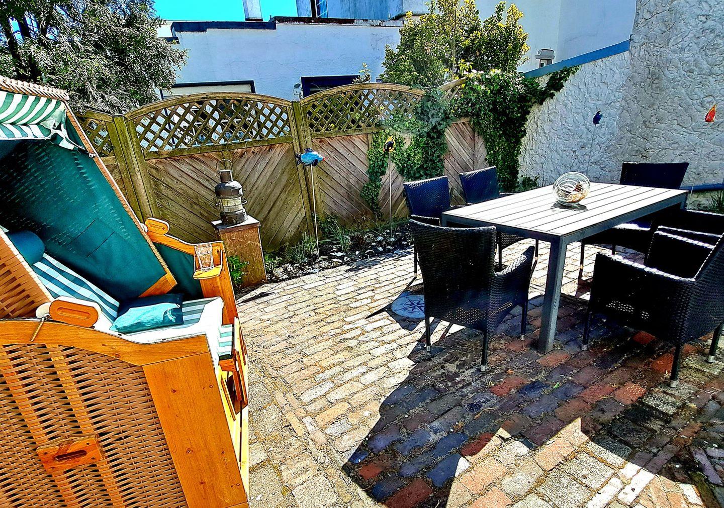 Von der Küche aus gelangen Sie in den ruhigen Gartenhof, welcher mit einem Strandkorb sowie Gartenmöbeln zum Verweilen einlädt.