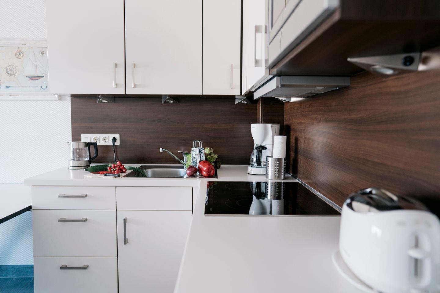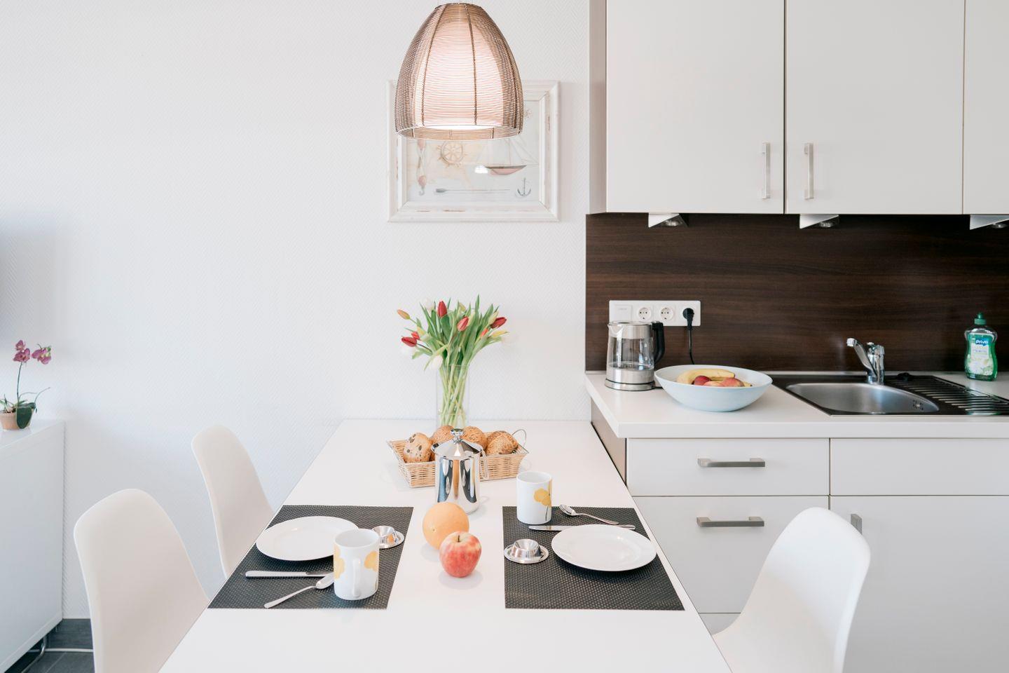Toaster, Wasserkocher und Kaffeemaschine laden zu Frühstück oder Teezeit ein.