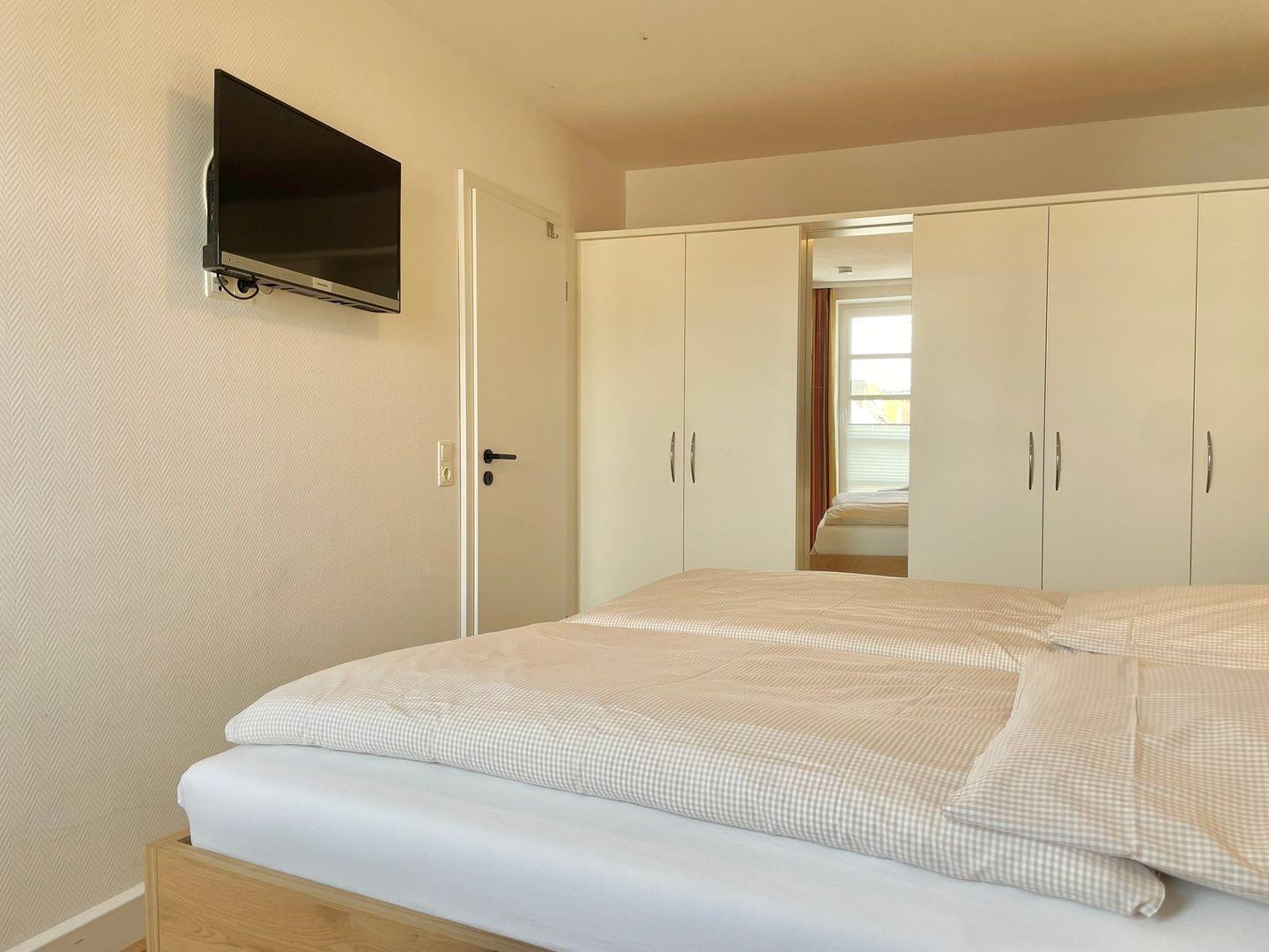 Neben einem Safe und Kabel-TV / Flachbildschirm im separaten Schlafzimmer befinden sich ein Doppelbett und ein großer Einbau- Kleiderschrank.