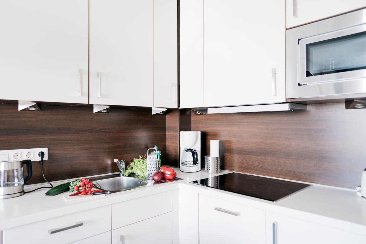 Die komfortable 2-Raum-Wohnung verfügt über eine in den Wohnraum integrierte, komplett eingerichtete Küchenzeile mit Geschirrspüler, Kühlschrank, Mikrowelle und Cerankochfeld.
