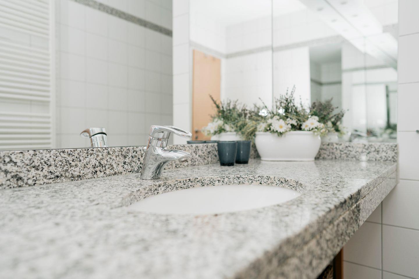Das Badezimmer ist modern eingerichtet und verfügt über einen großen Waschtisch mit Ablage, Dusche, WC, Haartrockner und Handtuchtrockner.