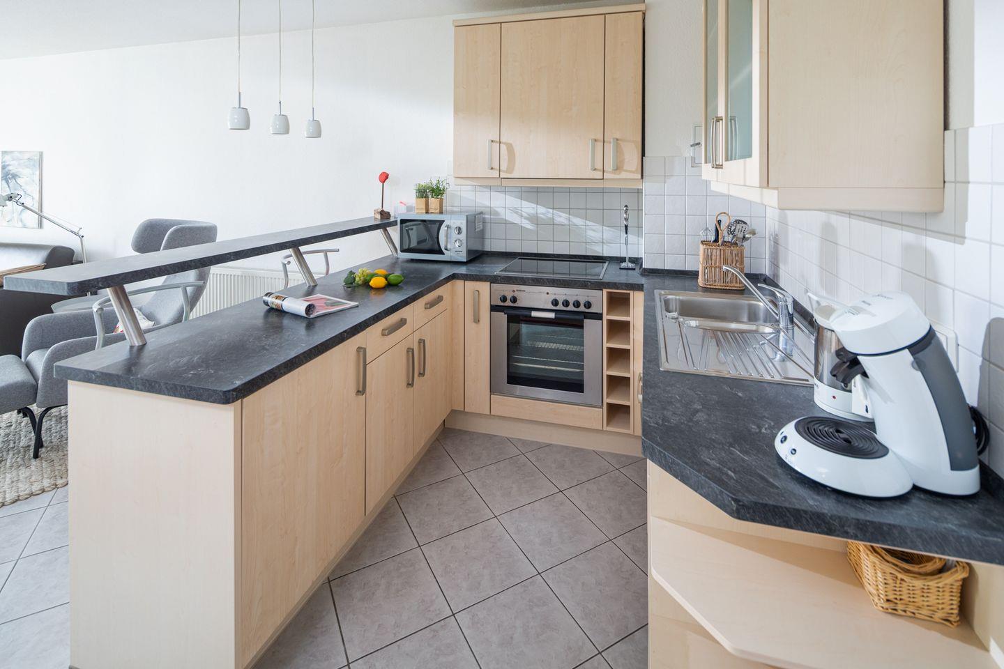 Diese großzügige Zweiraumwohnung im 3. Obergeschoss bietet auf etwa 60 m² modernen Komfort und eine freundliche Atmosphäre. Die helle, komplett geflieste Wohnung ist allergikerfreundlich und besticht durch eine geschmackvolle Einrichtung. Die offene Küchenecke ist mit allen wichtigen Geräten ausgestattet, darunter ein Kühlschrank, Backofen, Mikrowelle, Geschirrspüler, Kaffeemaschine, Pads-Kaffeemaschine, Toaster und Wasserkocher – ideal für die Zubereitung von Frühstück und umfangreichen Mahlzeiten. Ein eleganter Tresen trennt die Küche optisch vom Wohnbereich.