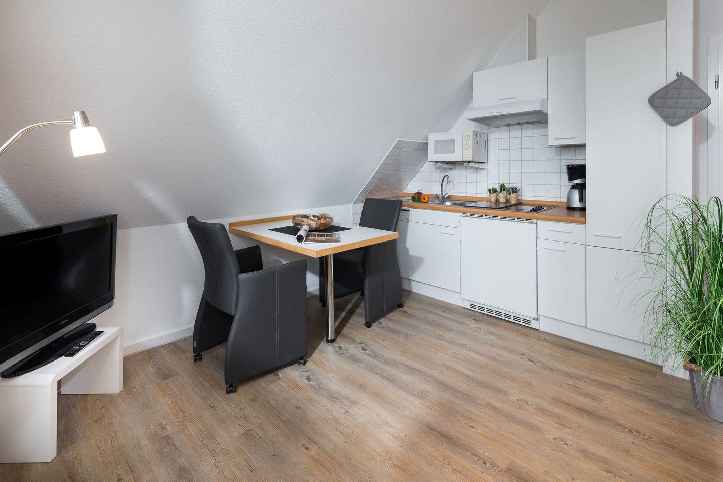 Die komplett eingerichtete Küchenzeile ist in den Wohnraum integriert und verfügt über einen Geschirrspüler. Ein kleiner Essbereich für zwei Personen lädt zu entspannten Mahlzeiten ein.