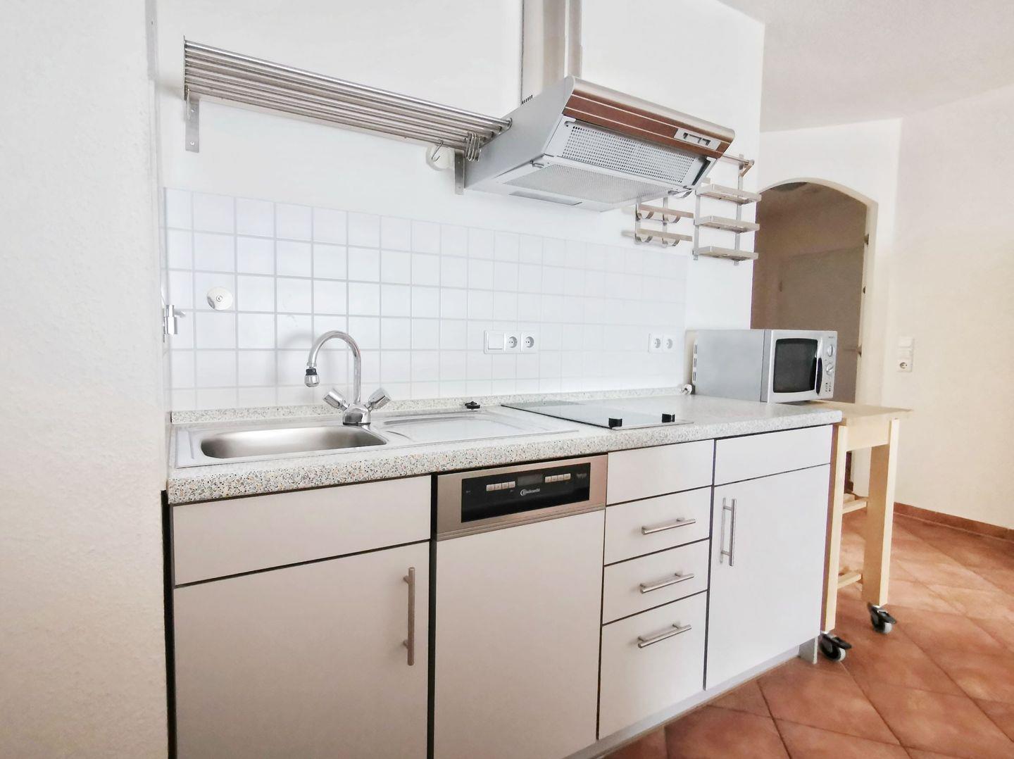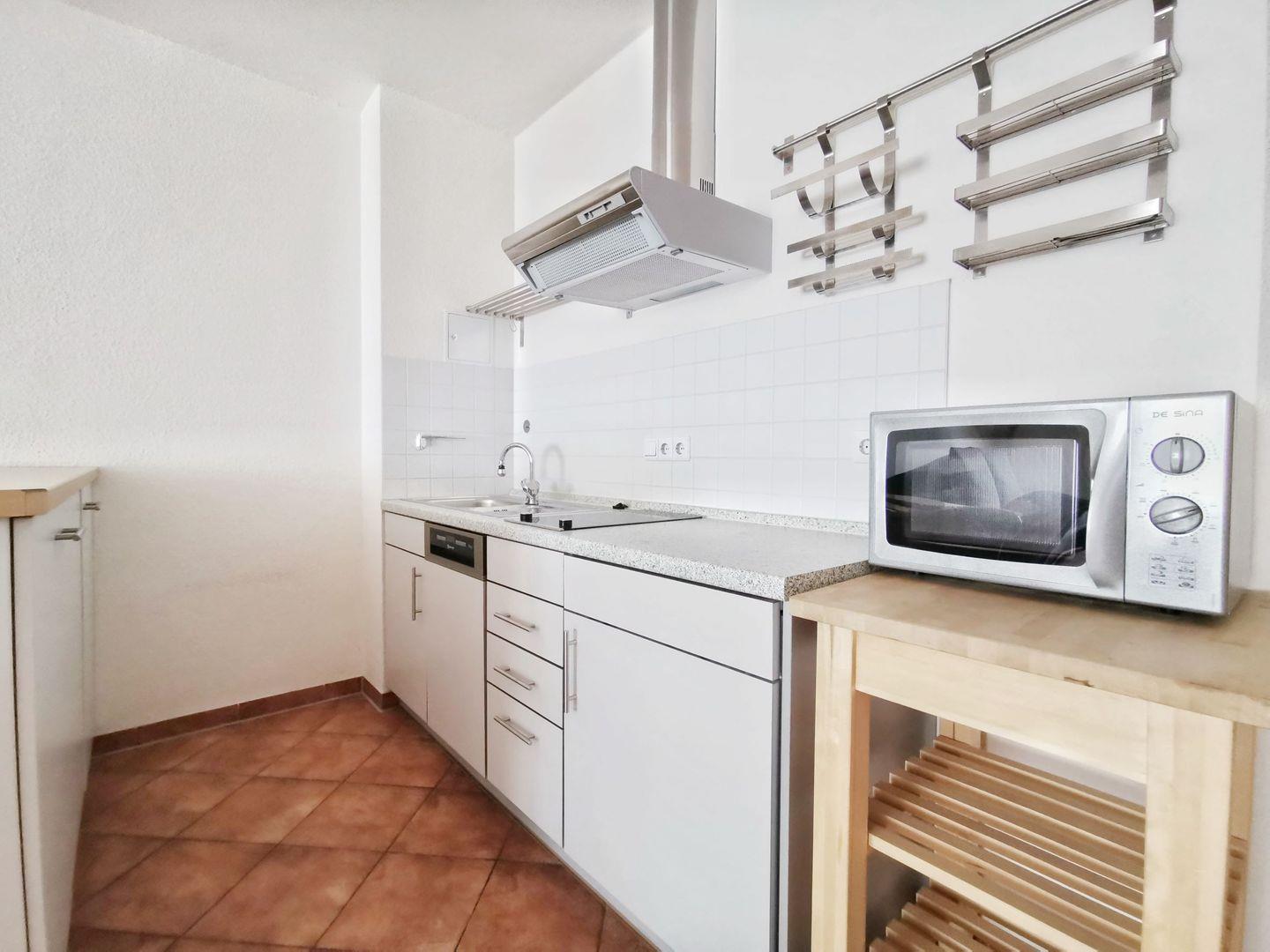 Die in den Wohnraum integrierte Küchenzeile ist komplett ausgestattet und verfügt über alle wichtigen Geräte wie Cerankochfeld, Geschirrspüler, Mikrowelle, Toaster, Kaffeemaschine und Wasserkocher. Ein Glastisch mit vier Korbstühlen schafft eine angenehme optische Trennung zwischen Wohn- und Küchenbereich und lädt zum gemeinsamen Frühstück ein.