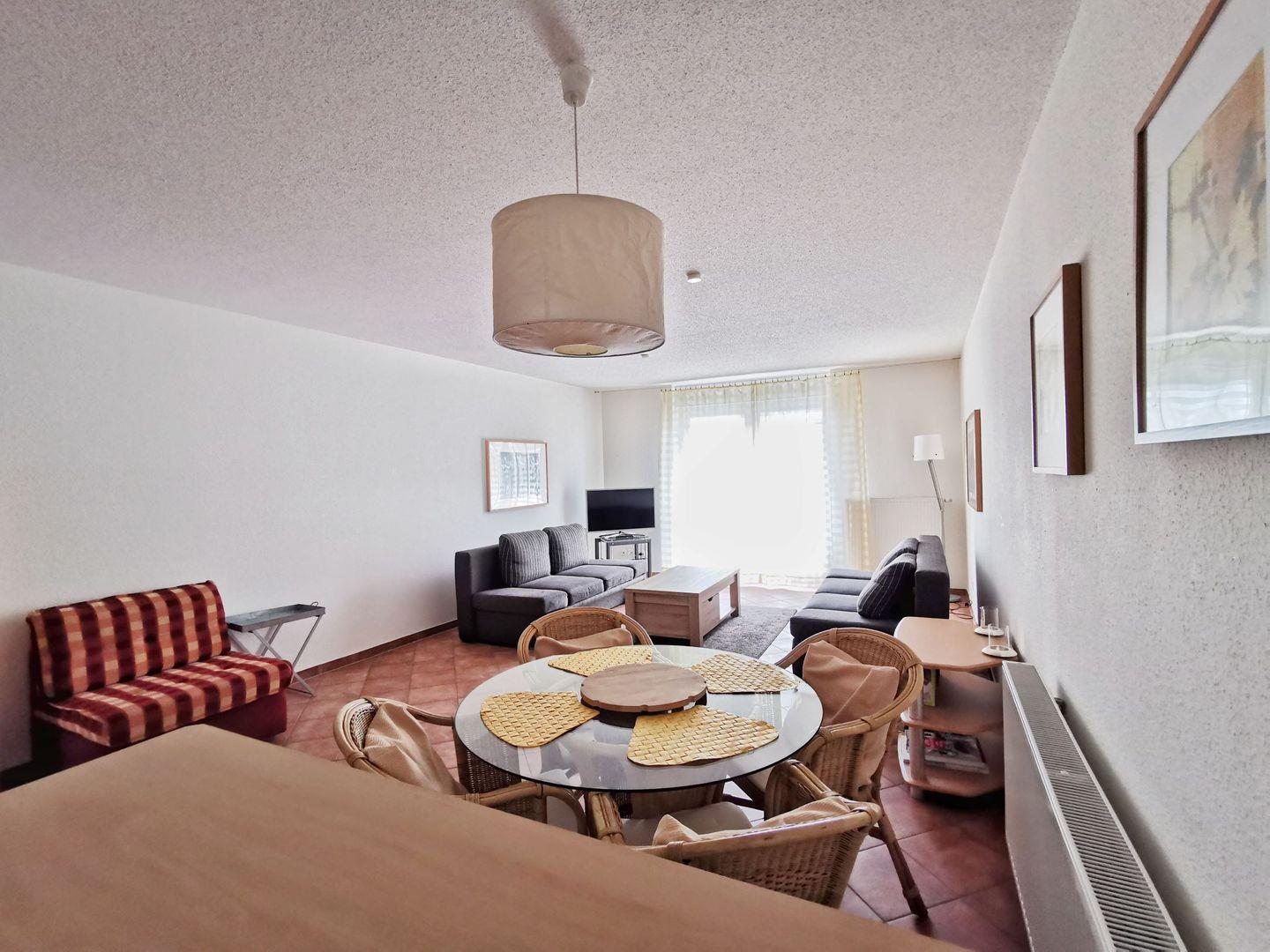 Die ca. 60 m² große Zweiraumwohnung im 1. Obergeschoss bietet modernen Komfort und eine freundliche Atmosphäre. Der großzügig geschnittene Wohnraum ist mit zwei bequemen Sofas ausgestattet, auf denen man es sich am Abend oder bei schlechtem Wetter mit einem guten Buch gemütlich machen kann. Für Unterhaltung sorgen ein Flachbild-Kabel-TV sowie eine kleine Stereoanlage. Zusätzlich bietet ein Schlafsessel eine weitere Schlafmöglichkeit für eine dritte Person.