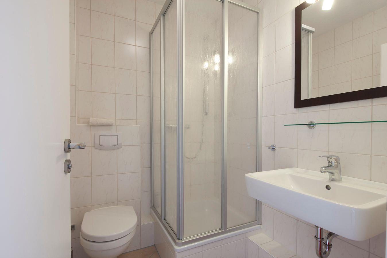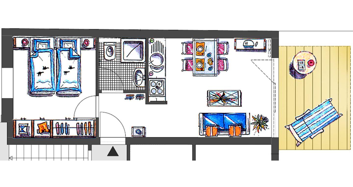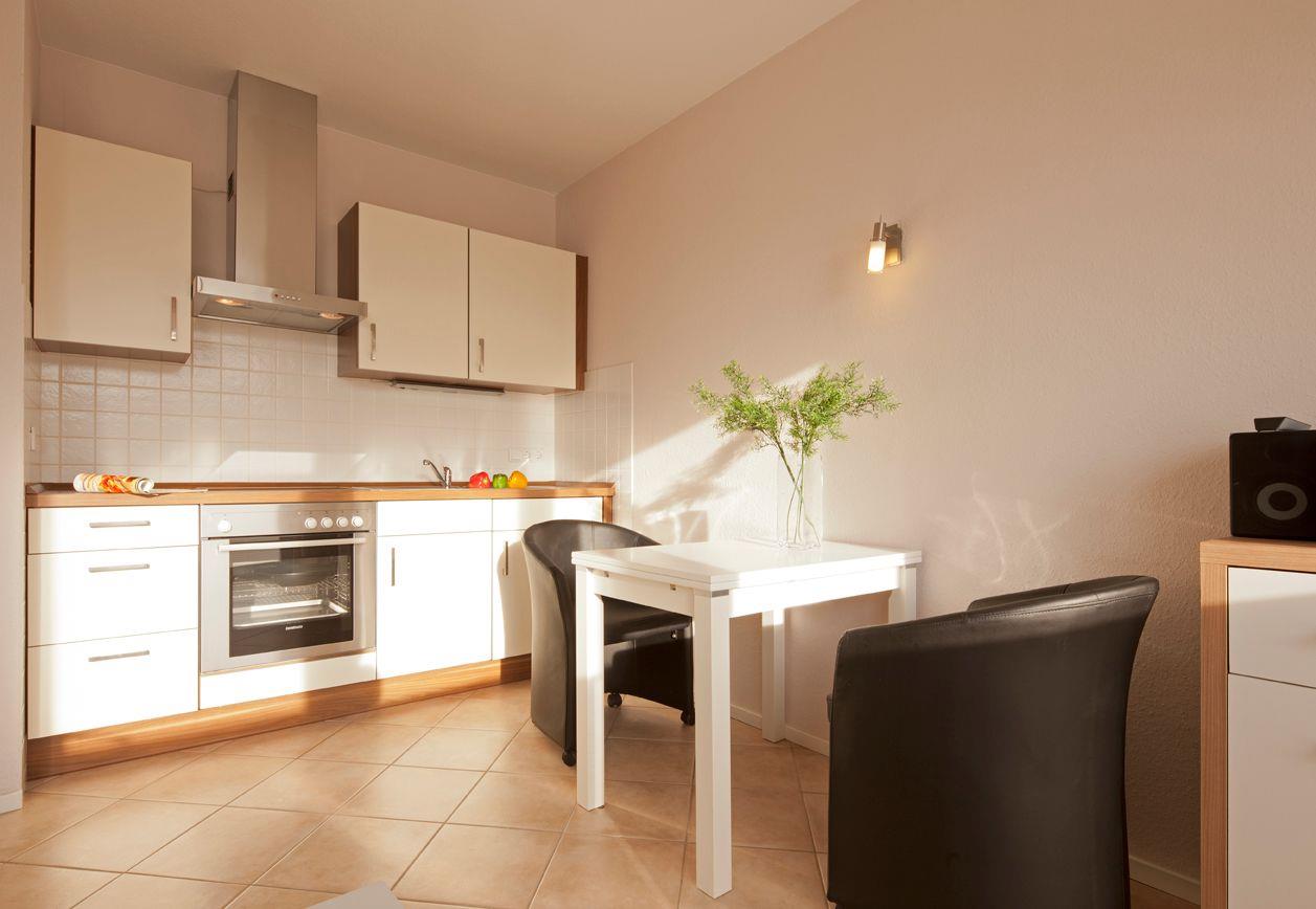 Der helle Wohnbereich ist modern eingerichtet und verfügt über eine integrierte Küchenzeile mit Ceran-Kochfeld, Backofen, Kühlschrank, Kaffeemaschine, Toaster und Wasserkocher. Direkt angrenzend finden Sie einen sonnigen Essplatz, der zum gemeinsamen Frühstück oder Abendessen einlädt. Von hier aus gelangen Sie auf den Balkon, der für frische Luft und schöne Ausblicke sorgt.