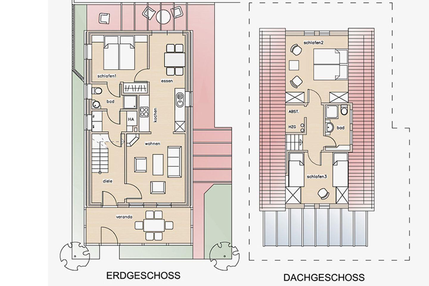 Das Haus verfügt über drei Schlafräume. Eines mit Doppelbett im Erdgeschoss und zwei weitere in der oberen Etage. In einem der Schlafzimmer stehen die Betten auseinander.