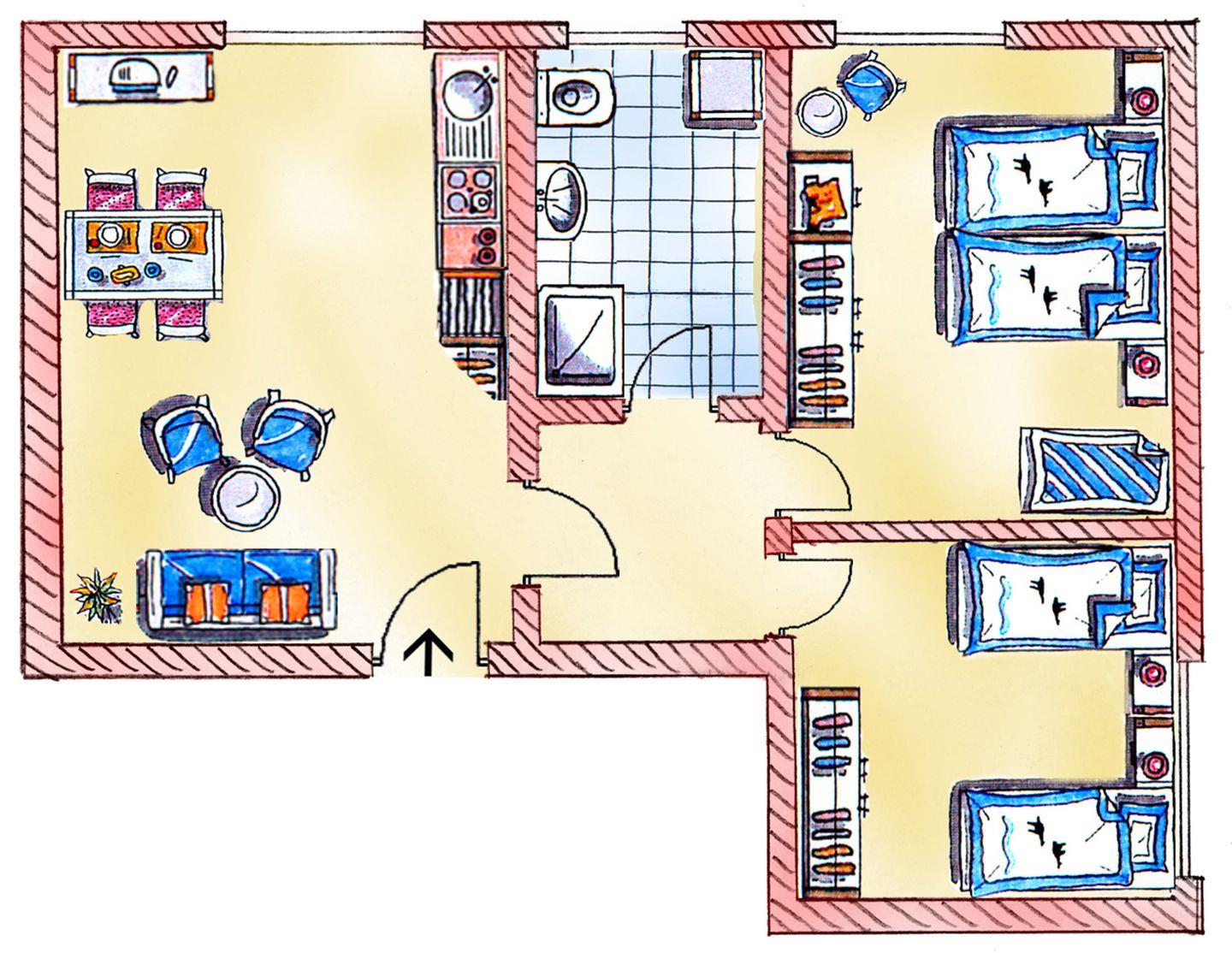 3-Raum-Ferienwohnung, 2 getrennte Schlafzimmer, eins mit Doppelbett und eins mit zwei Einzelbetten,