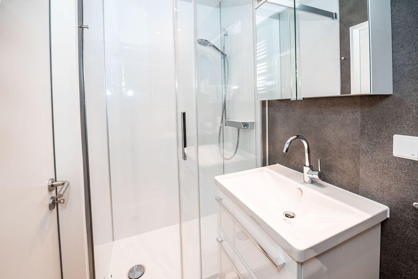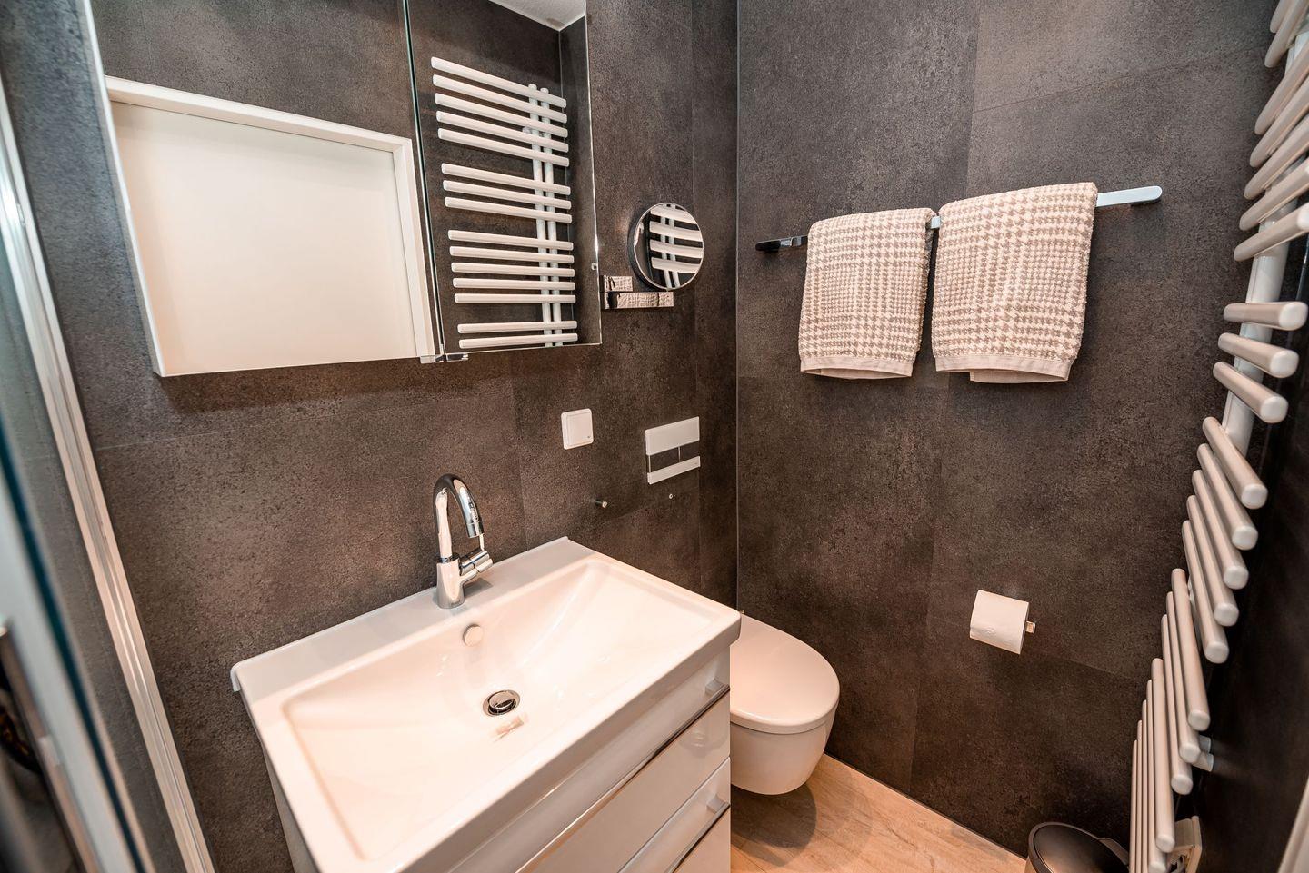 Im separaten Schlafzimmer befinden sich zwei getrennte Betten, die erholsamen Schlaf garantieren. Ein kleiner Nachttisch bietet Platz für ein Buch oder persönliche Gegenstände. Das Badezimmer ist modern gestaltet und verfügt über eine Dusche und ein WC.