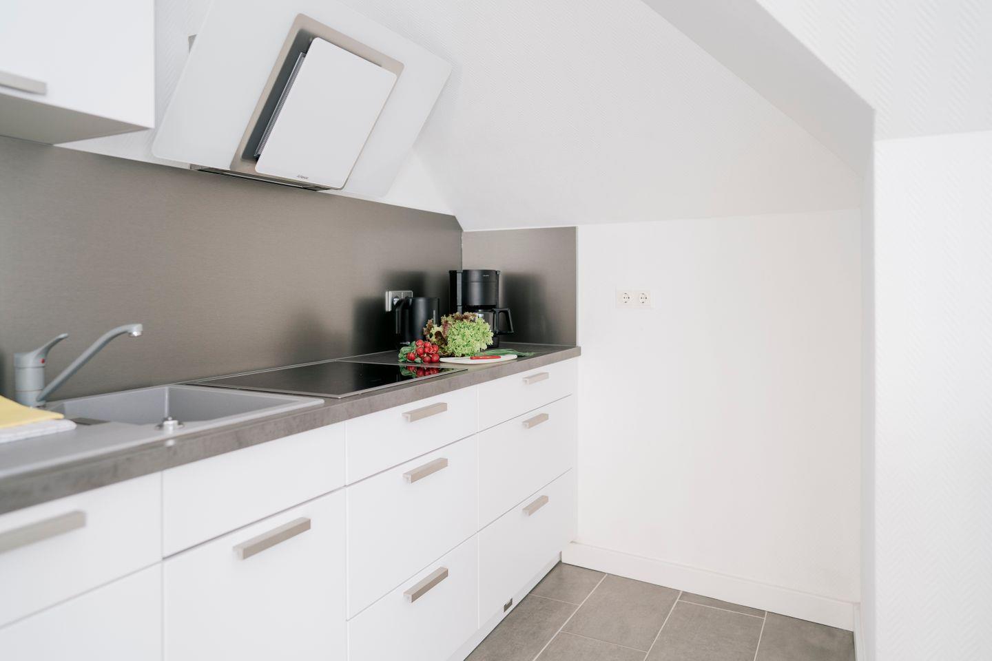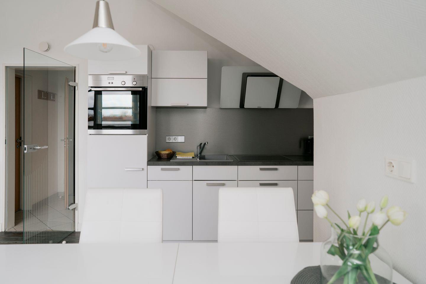 Eine in den Wohnraum integrierte Küchenzeile mit Cerankochfeld, Geschirrspüler, Backofen und Kühlschrank macht Lust auf Kochen.