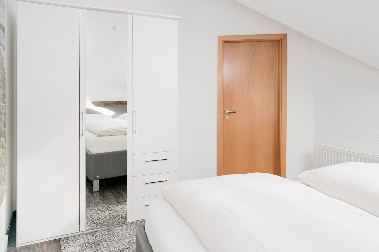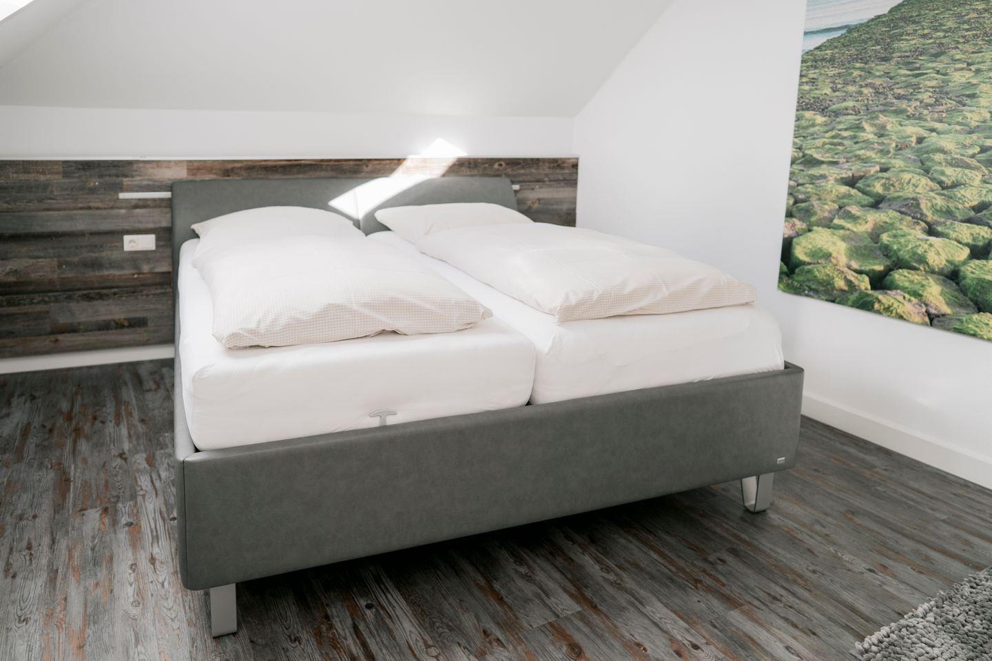 Die Schlafplätze liegen im separaten Schlafzimmer (Doppelbett) und im Wohnraum (ausziehbare Couch mit Lattenrost).