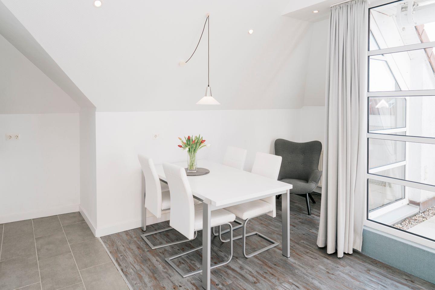 Ein gemütlicher Essplatz unter einer Schräge, ein Abstellraum sowie ein Flur ergänzen diese Ferienwohnung. Der Balkon hat Südlage und ist mit Tisch, Stühlen und einer Markise ausgestattet.