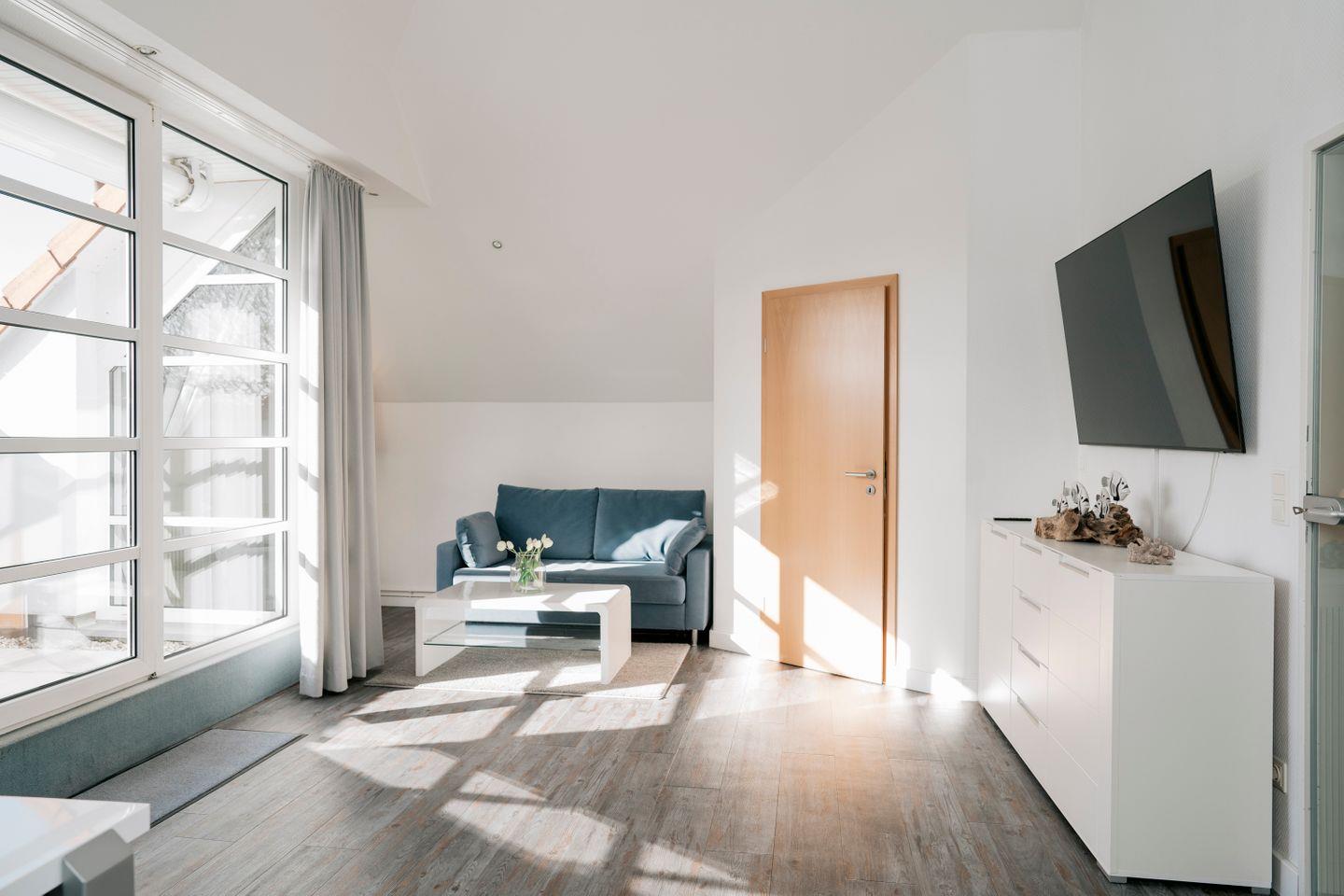 Dieses komfortable Feriendomizil mit teilweise schrägen Wänden verfügt über ein geräumiges und gemütlich eingerichtetes Wohnzimmer sowie über einen separaten Schlafraum.