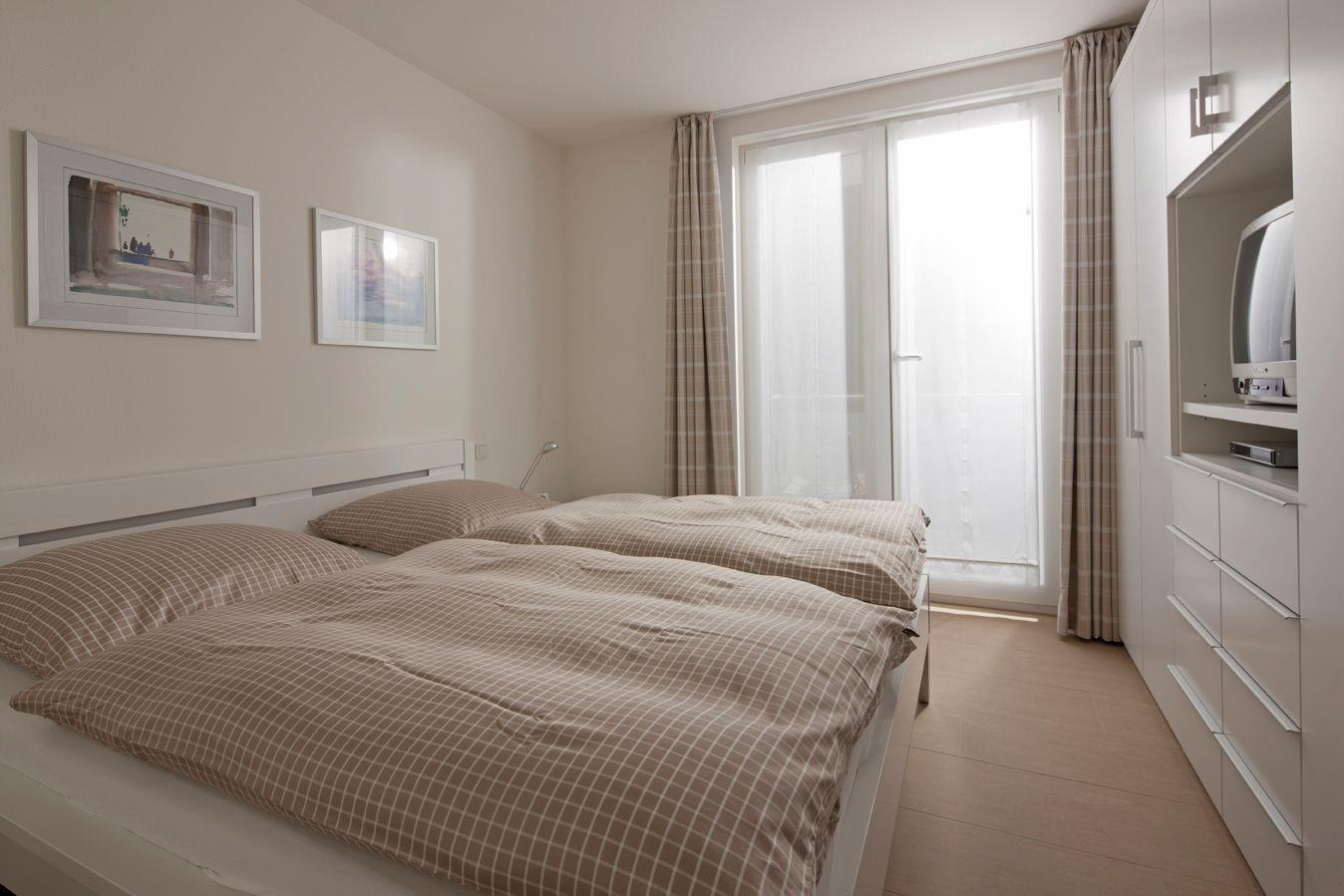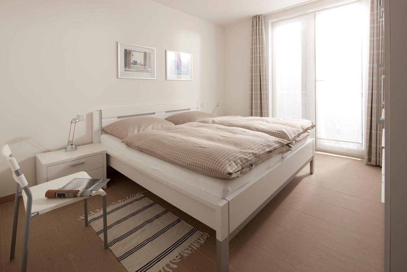 Das ebenfalls in Weiß gehaltene separate Schlafzimmer (220er Betten) hält für Sie einen Fernseher und einen großen Ostbalkon für die Morgensonne bereit. Bis auf den Schlafraum sind alle Räume mit einer Fußbodenheizung ausgestattet.