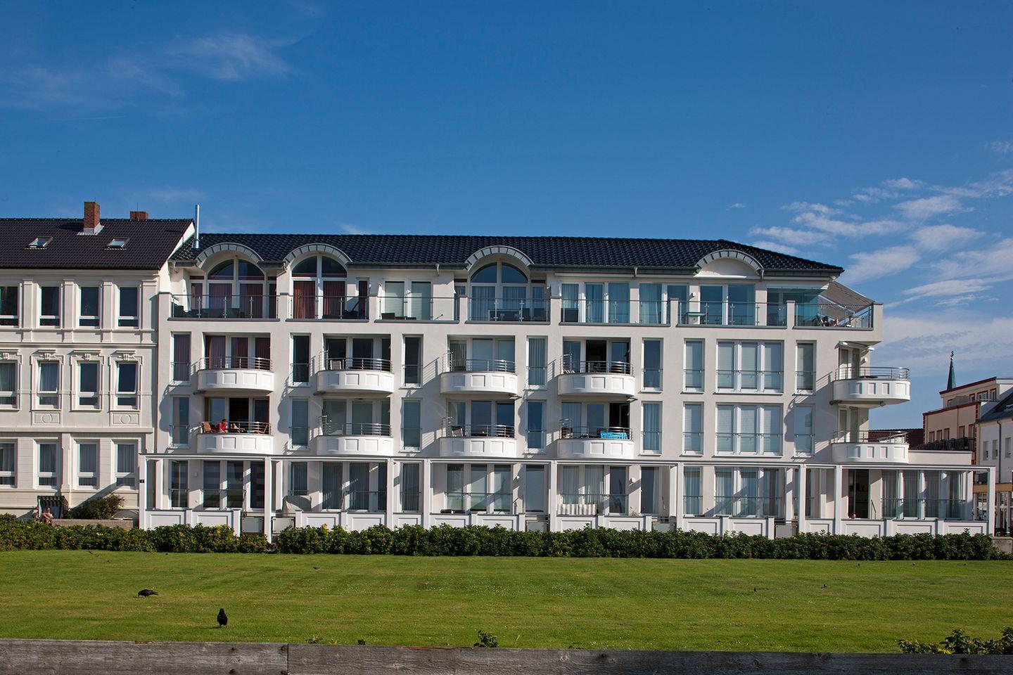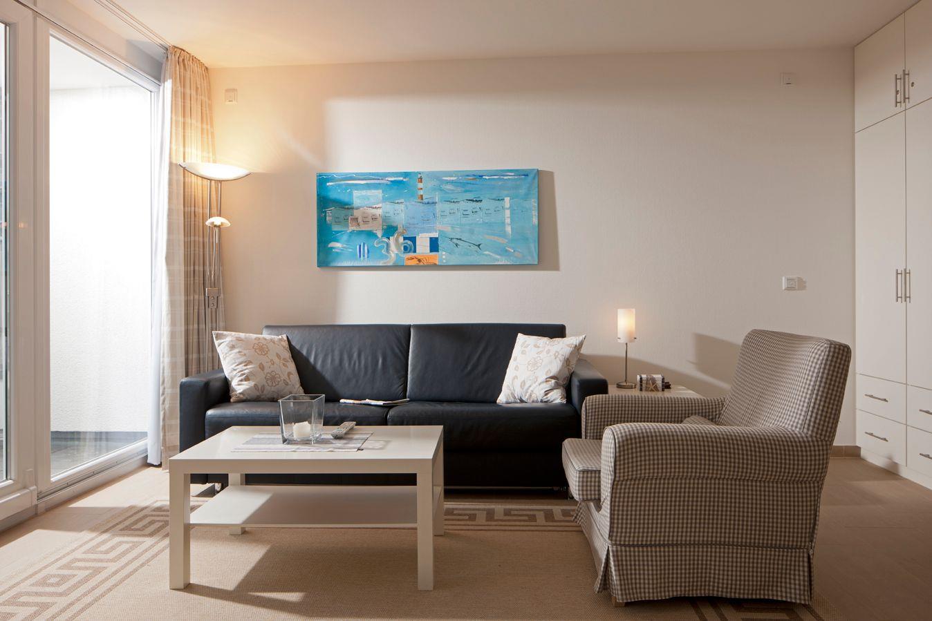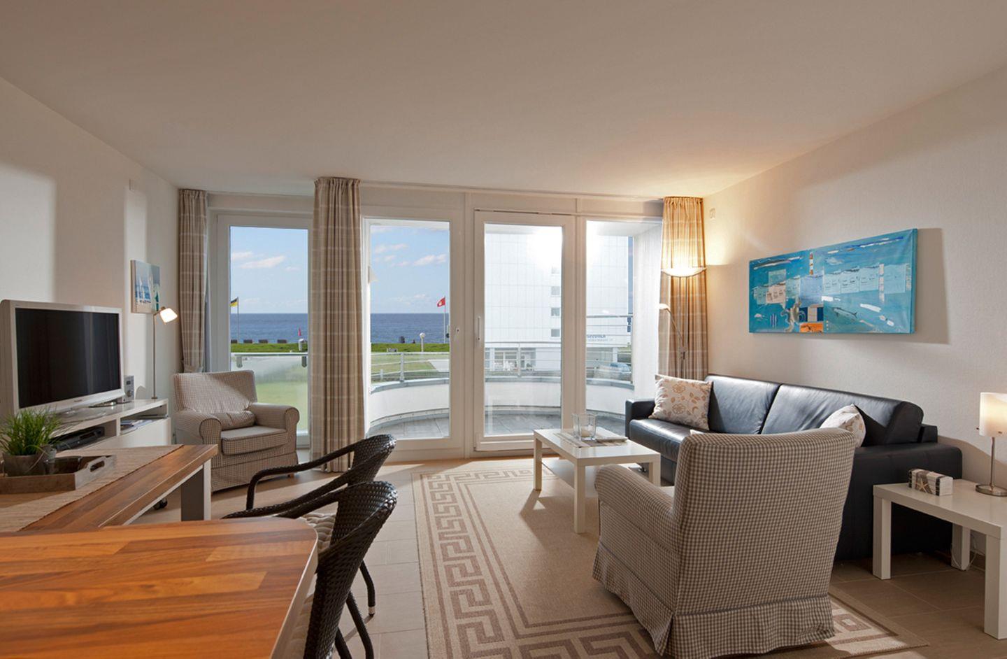 Der mit weißen Möbeln ausgestattete helle Wohnraum mit Zugang zum geräumigen Westbalkon genießt man den unverbauten Blick auf die Nordsee.