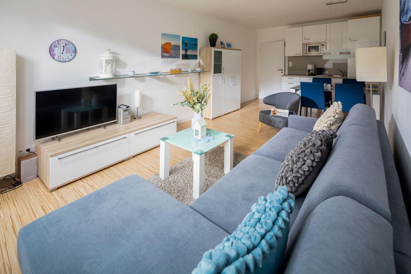 Der helle Wohnbereich lädt mit einem gemütlichen Schlafsofa zum Verweilen ein. Für Unterhaltung sorgen ein Smart-TV sowie eine Stereoanlage. Eine große Fensterfront sorgt für angenehmes Tageslicht und schafft eine einladende Atmosphäre.