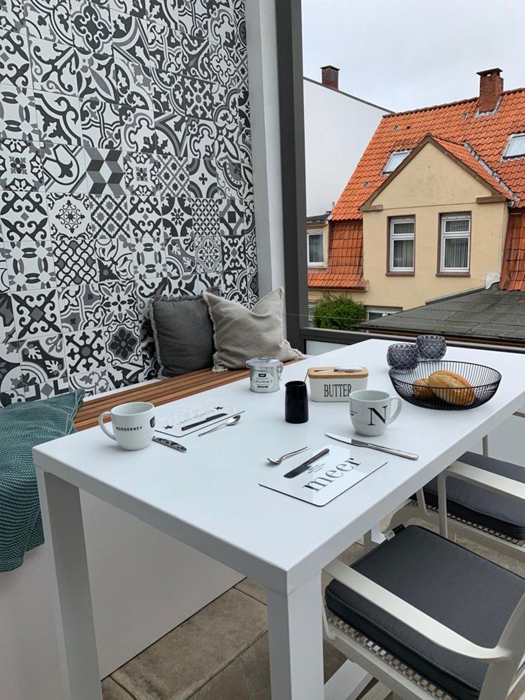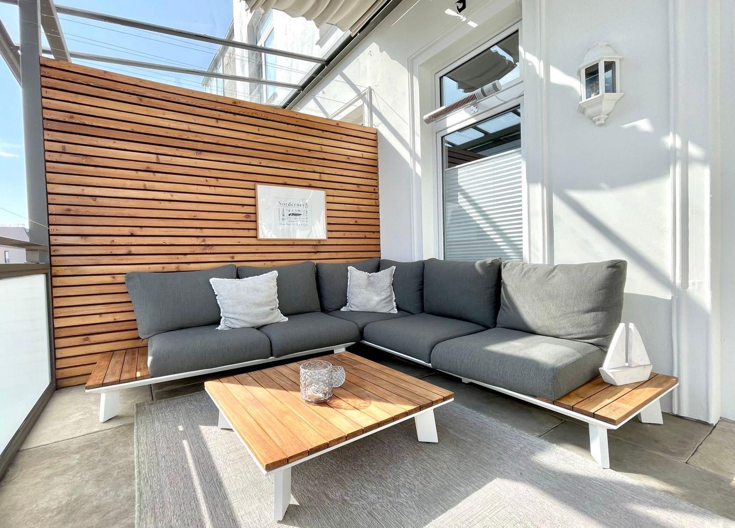 Ein echtes Highlight ist der ca. 15 m² große, komplett überdachte Balkon, den Sie direkt vom Wohnzimmer aus betreten. Ausgestattet mit zwei regulierbaren Heizstrahlern, einem Esstisch sowie einer bequemen Sofa-Lounge ist er auch an kühleren Tagen der perfekte Ort zum Genießen und Verweilen im Freien.