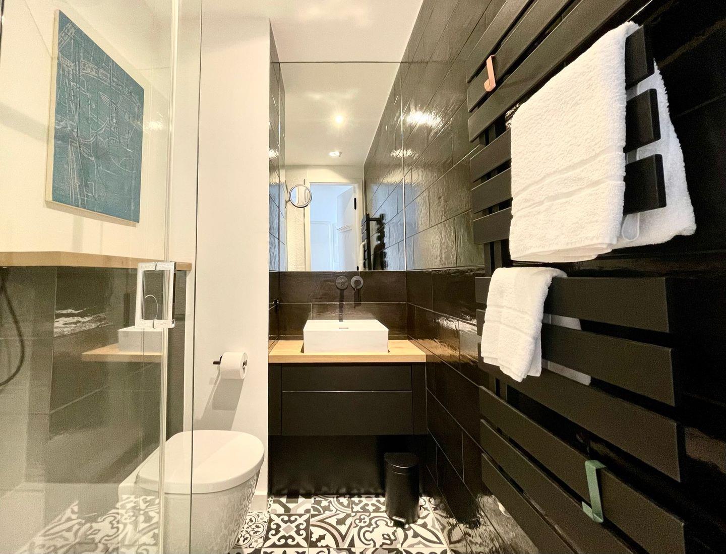 Im modernen Badezimmer erwartet Sie eine bodentiefe Regenbogendusche, die jeden Tag mit einem Hauch von Luxus beginnen lässt.