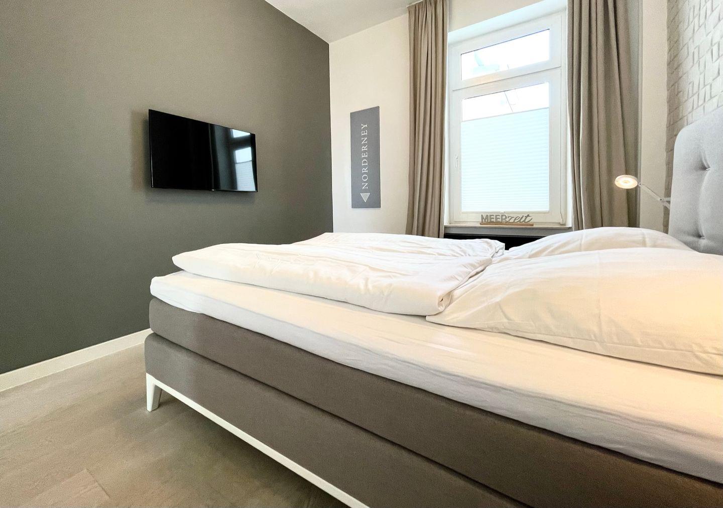 Das separate Schlafzimmer überzeugt mit einem hochwertigen Boxspringbett, einem geräumigen Kleiderschrank und einem zweiten TV – für entspannte Rückzugsmomente.