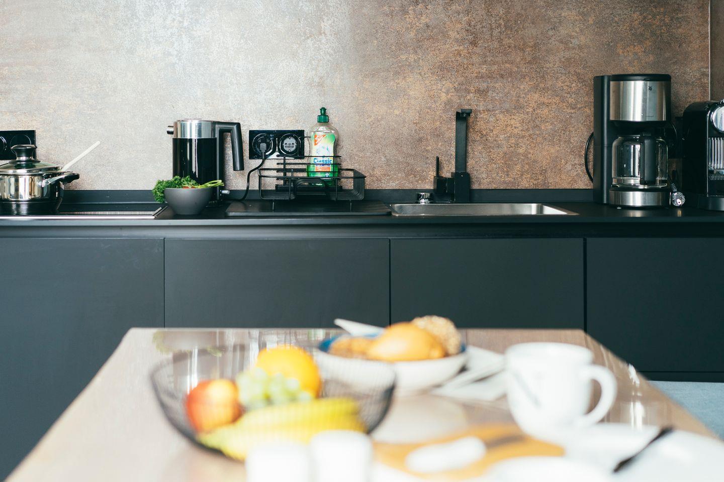 Die offen gestaltete Küchenzeile ist direkt in den Wohnraum integriert und bietet alles, was Sie zum Kochen brauchen – ideal für Selbstversorger.